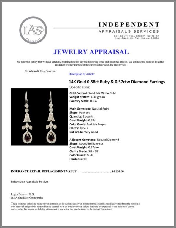 Regarding Appraised Jewelry and Loose Stones - Auctionfarm sends them out to a third party for Retail Replacement Value Appraisals, which are the most common. These types of evaluations are written for insurance needs. This would be the cost to replace the jewelry with an item of equal quality and kind, considered to be the current market price or the replacement value. This type of appraisal is done to protect you in the event of damage or loss of a valuable item. Our appraisals are conducted by independent 3rd Party appraisal firms that utilizes Certified GIA Gemologist. Appraisals should be used for verification of gemstone and/or metal weight, size, and grade only, not actual value. Appraisal value should be considered for insurance purposes only, not actual value, as price varies greatly from retail locations thru out the world. Items should not be purchased with the expectation to resell for appraisal price, or for profit.