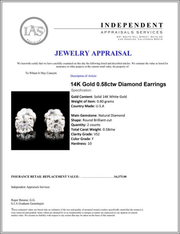 Regarding Appraised Jewelry and Loose Stones - Auctionfarm sends them out to a third party for Retail Replacement Value Appraisals, which are the most common. These types of evaluations are written for insurance needs. This would be the cost to replace the jewelry with an item of equal quality and kind, considered to be the current market price or the replacement value. This type of appraisal is done to protect you in the event of damage or loss of a valuable item. Our appraisals are conducted by independent 3rd Party appraisal firms that utilizes Certified GIA Gemologist. Appraisals should be used for verification of gemstone and/or metal weight, size, and grade only, not actual value. Appraisal value should be considered for insurance purposes only, not actual value, as price varies greatly from retail locations thru out the world. Items should not be purchased with the expectation to resell for appraisal price, or for profit.