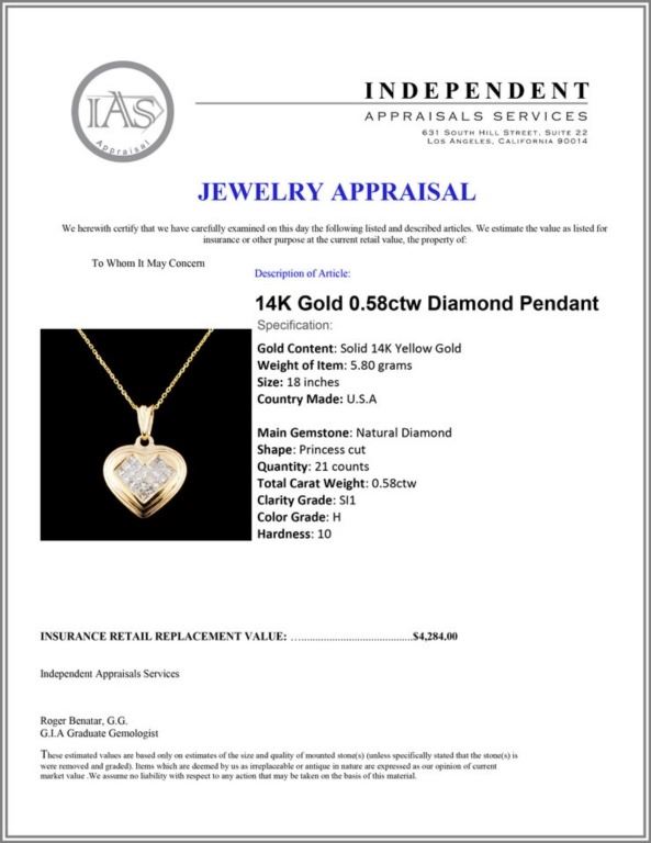Regarding Appraised Jewelry and Loose Stones - Auctionfarm sends them out to a third party for Retail Replacement Value Appraisals, which are the most common. These types of evaluations are written for insurance needs. This would be the cost to replace the jewelry with an item of equal quality and kind, considered to be the current market price or the replacement value. This type of appraisal is done to protect you in the event of damage or loss of a valuable item. Our appraisals are conducted by independent 3rd Party appraisal firms that utilizes Certified GIA Gemologist. Appraisals should be used for verification of gemstone and/or metal weight, size, and grade only, not actual value. Appraisal value should be considered for insurance purposes only, not actual value, as price varies greatly from retail locations thru out the world. Items should not be purchased with the expectation to resell for appraisal price, or for profit.