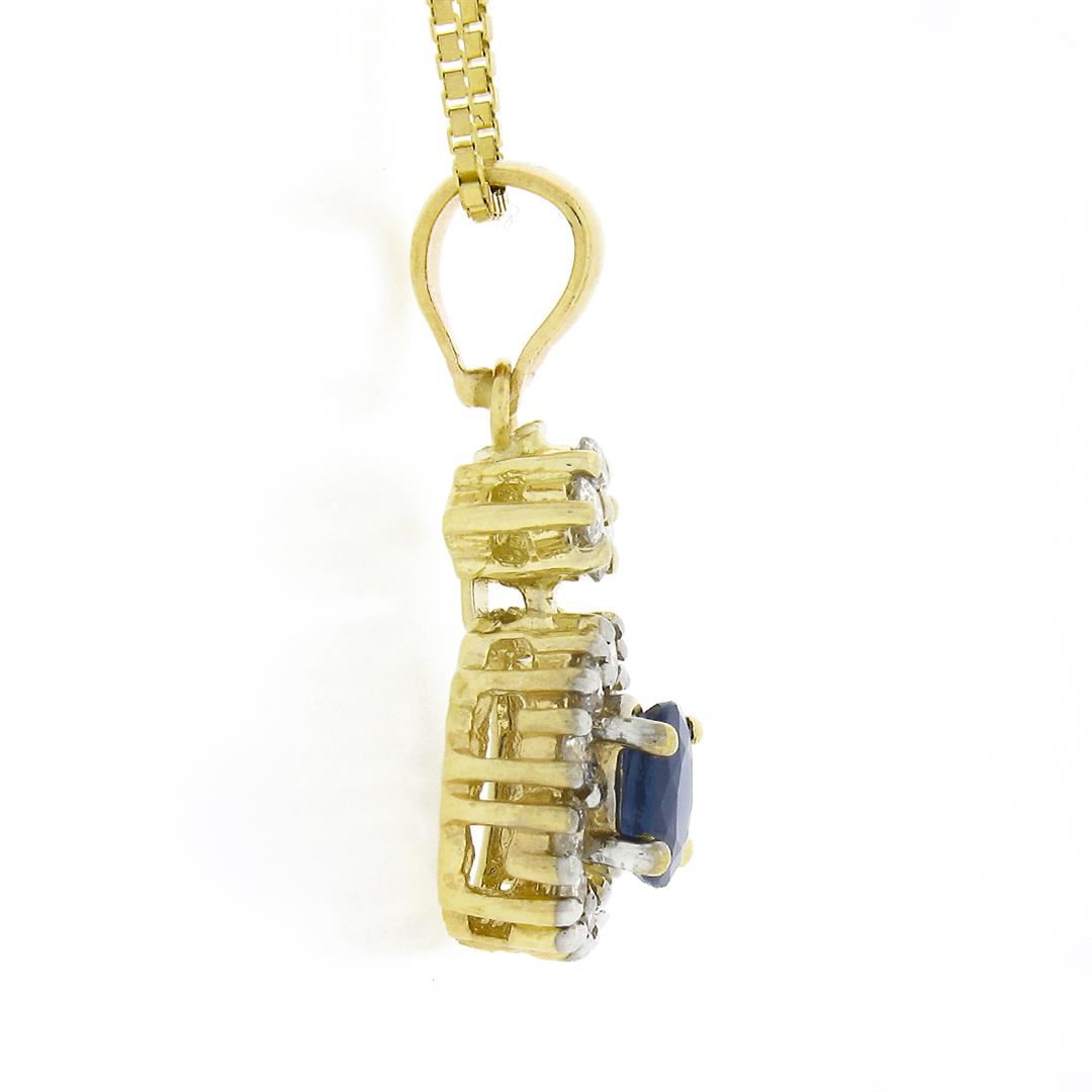 A solid 14k yellow gold pendant necklace, with 1 oval brilliant cut natural blue sapphire (0.40ctw), surrounded with 14 round brilliant cut natural diamonds (H/I - SI2/I1 ; 0.45ctw). The pendant weighs a total of 4.27 grams, measures 21.0x8.20mm including