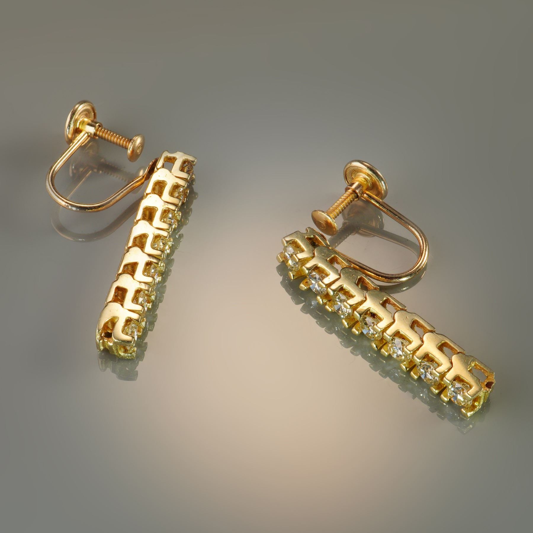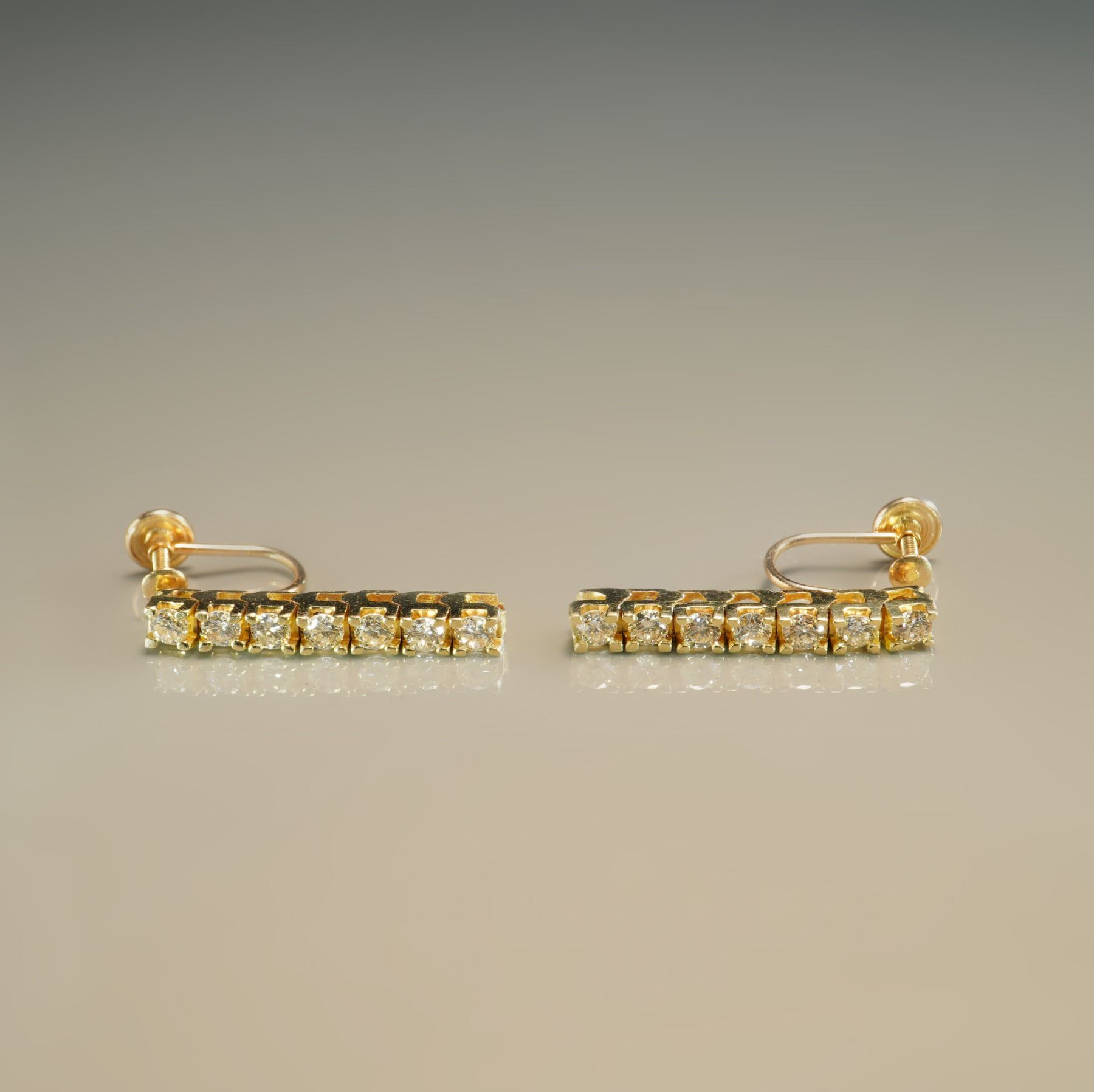 A refined pair of 14K gold bar drop earrings, each set with seven sparkling round diamonds for a total of 14 stones weighing approximately 1.00 carat. The clean vertical design emphasizes the brilliance of the diamonds, creating a sleek, timeless look that can be worn for both everyday elegance and special occasions. Completed with secure screw-back posts, these earrings balance classic craftsmanship with a modern, minimalist silhouette. Total weight: 4.16g.