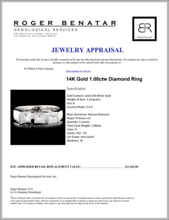 Estimated Retail Replacement Value: $11,025.00Ref: WAG6300Item no.: EJT005Specification:Gold Content: Solid 14K White Gold Weight of Item: 4.10 gramsSize: 8Country Made: U.S.A Main Gemstone: Natural Diamond Shape: Princess cutQuantity: 3 countsTotal Carat Weight: 1.08ctwColor: G Clarity: VS2 - SI1Cut Grade: Very GoodHardness: 10 Great Condition - Shipping notes: We ship 4-10 Business day after the clearance of payment. Tracking numbers are emailed once the package(s) are shipped. Most shipments are sent by FEDEX Priority, UPS Priority, or US PRIORITY MAIL INSURED