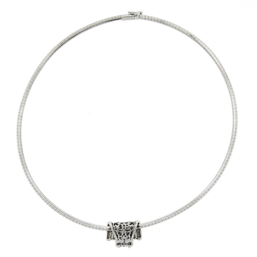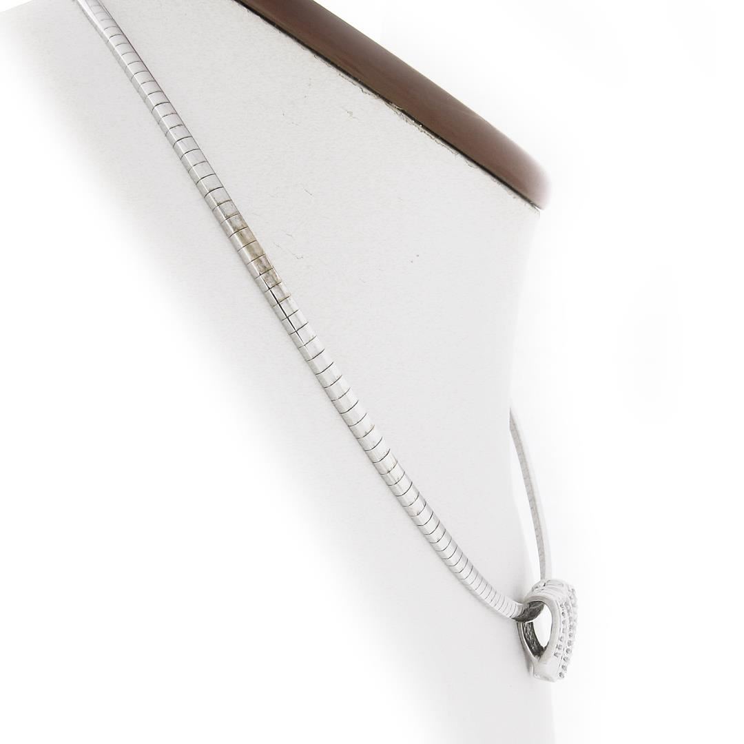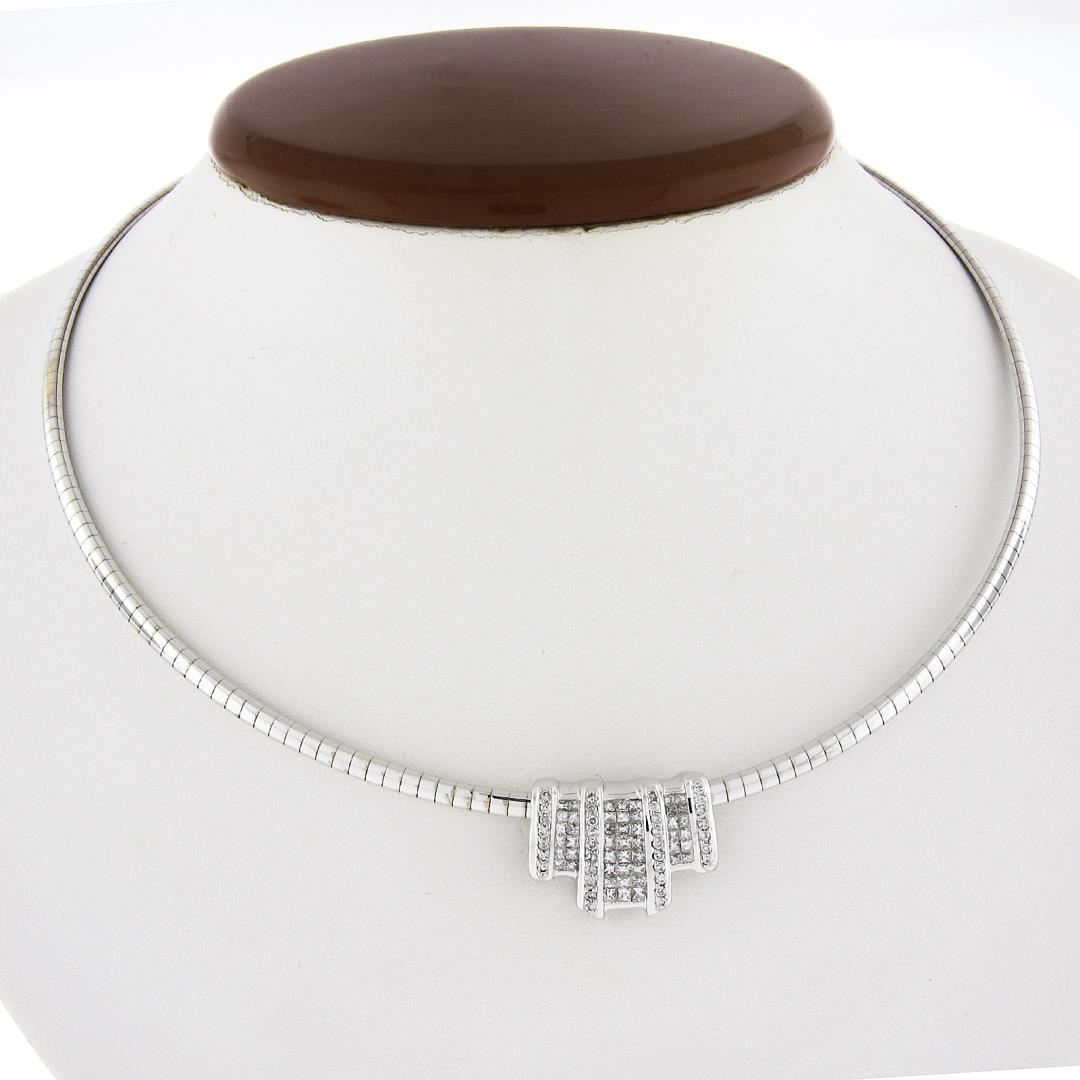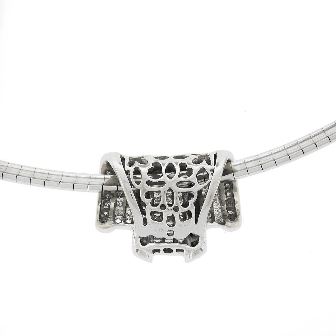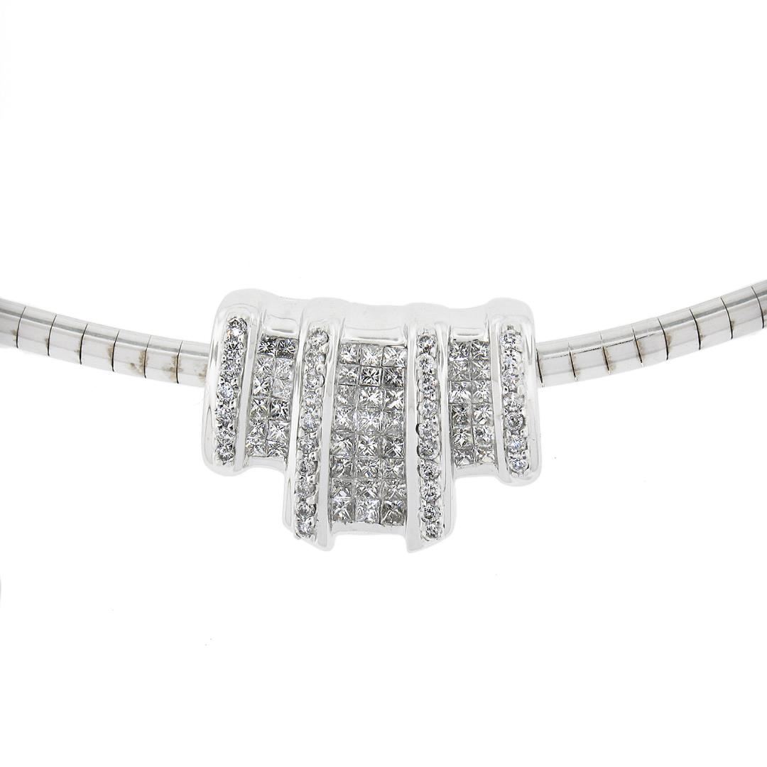 A solid 14k white gold pendant necklace, with 48 princess cut natural diamonds (H/I - VS2/SI1 ; 0.90ctw ), and 34 round brilliant cut natural diamonds (H/I - SI2/I1 ; 0.25ctw). 16 inch omega link chain, 24.21 grams total weight, pendant measures 15.7x20.8mm.