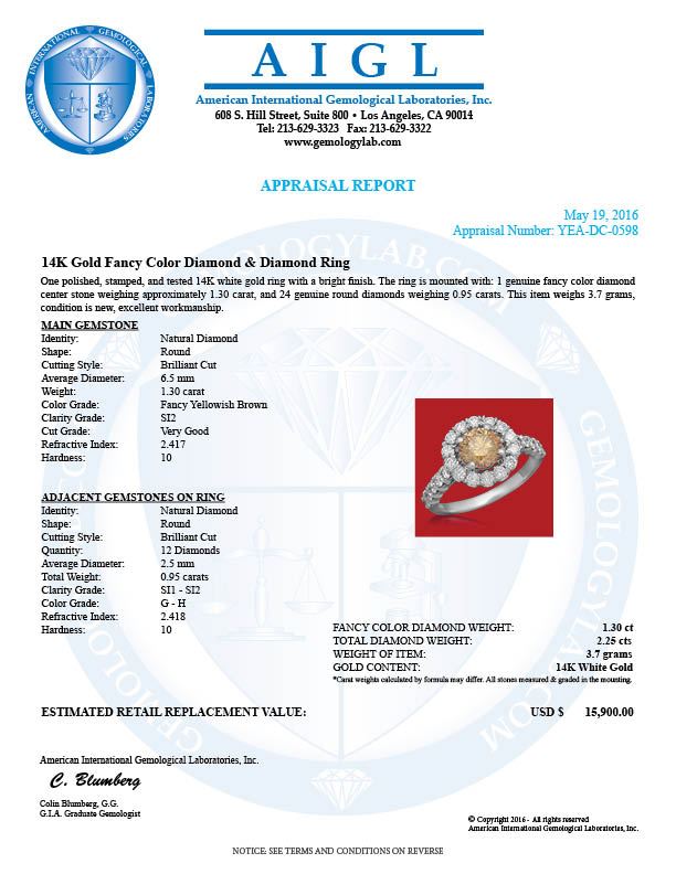 Retail: $15,900.00 ****** 14K Gold 1.30ct Fancy Color Diamond 2.25ct Diamond Ring****** Metal: 14K Solid Gold / Total Item Weight: 3.7 grams / Country Made: United States / / Main Stone: Fancy Color Diamond / Color: Fancy Yellowish Brown / Carat Total Weight: 1.30 / Treatment: None / Cut: Very Good / / Secondary Stone: Diamond / Carat Total Weight: 2.25 / Treatment: None / Color Grade: G - H / Clarity: SI1 - SI2 / Cut: Round Brilliant /