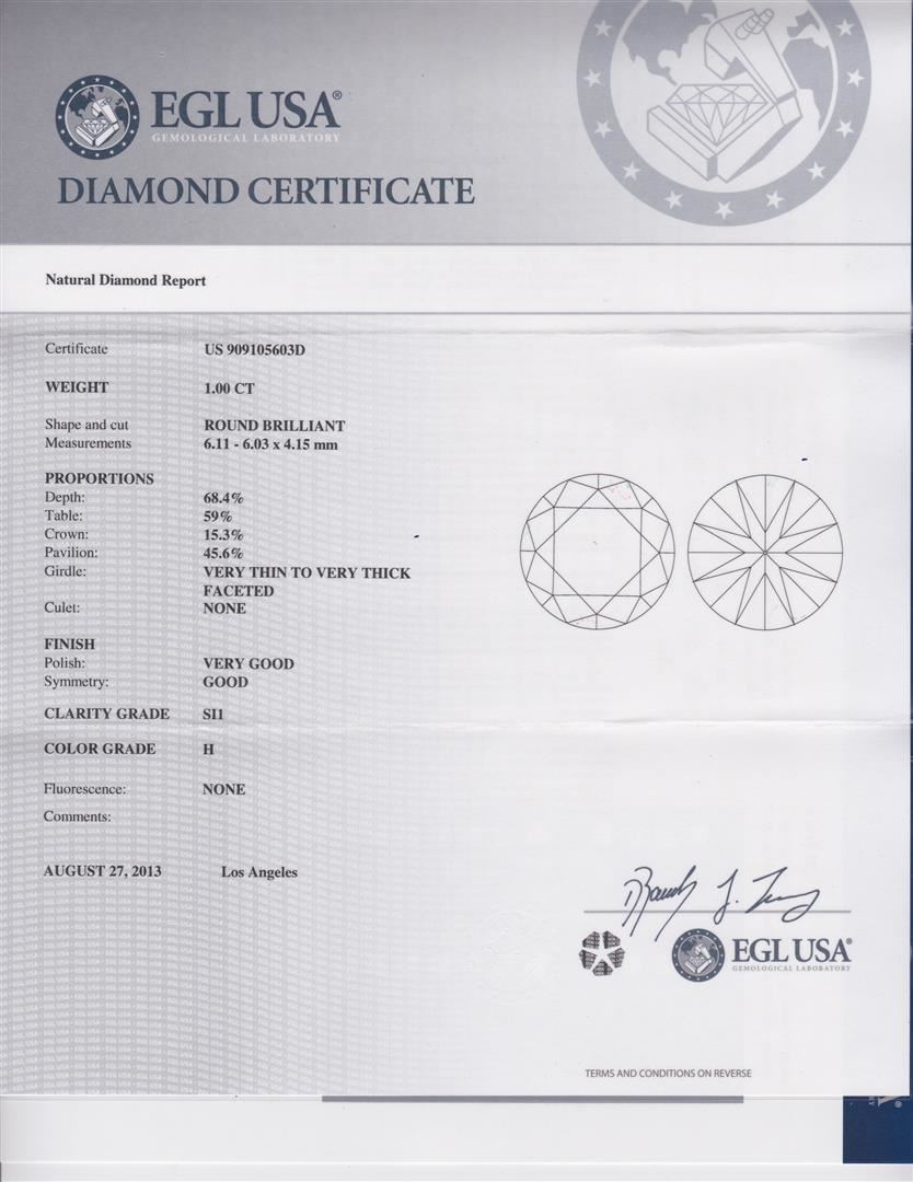 Retail: $13,100.00 ****** 14K Gold 1.44cts Diamond Ring ****** Metal: 14K Solid Gold / Total Item Weight: 3.0 grams / Country Made: United States / / Main Stone: Diamond / Carat Total Weight: 1.00 / Treatment: None / Cut: Very Good / Color Grade: H / Clarity Grade: SI1 / Cut: Round Brilliant / Secondary Stone: Diamond / Carat Total Weight: 0.44 / Treatment: None / Cut: Very Good / Color Grade: G - H / Clarity: SI1 - SI2 / Cut: Round Brilliant /