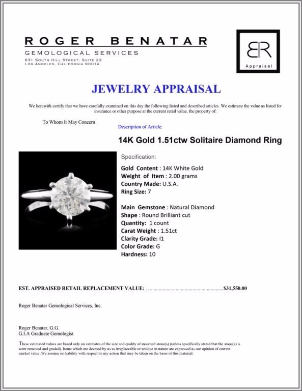 14K Gold 1.51ctw Solitaire Diamond Ring