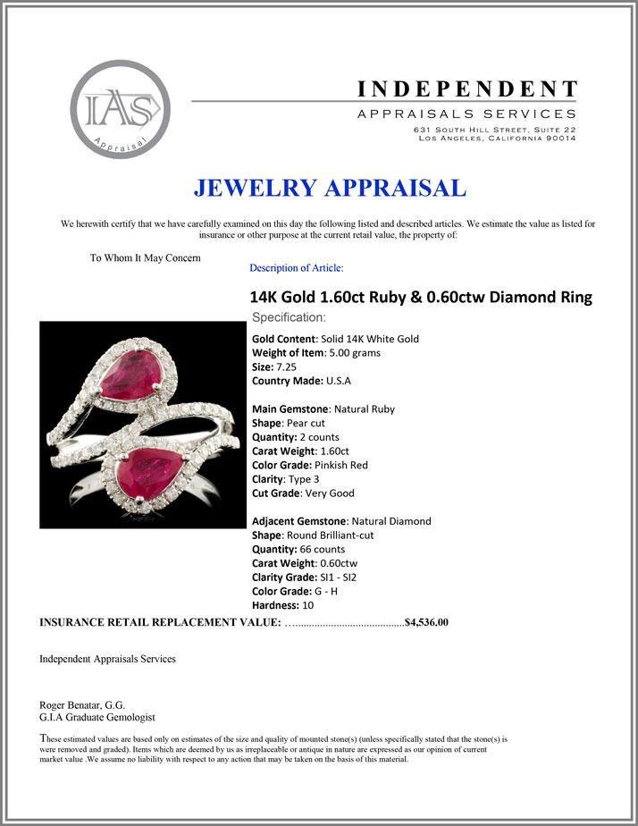 14K Gold 1.60ct Ruby & 0.60ctw Diamond Ring