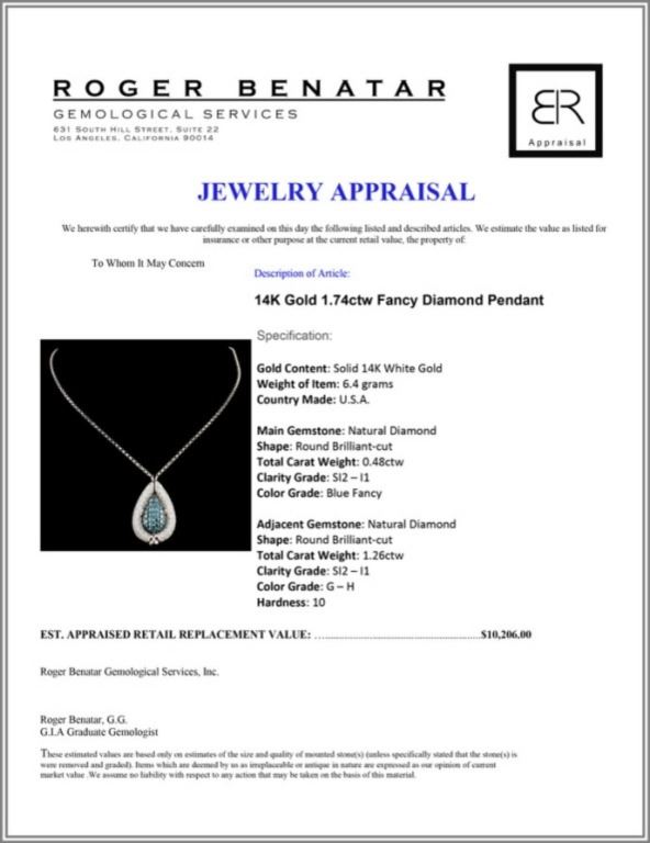 Regarding Appraised Jewelry and Loose Stones - Auctionfarm sends them out to a third party for Retail Replacement Value Appraisals, which are the most common. These types of evaluations are written for insurance needs. This would be the cost to replace the jewelry with an item of equal quality and kind, considered to be the current market price or the replacement value. This type of appraisal is done to protect you in the event of damage or loss of a valuable item. Our appraisals are conducted by independent 3rd Party appraisal firms that utilizes Certified GIA Gemologist. Appraisals should be used for verification of gemstone and/or metal weight, size, and grade only, not actual value. Appraisal value should be considered for insurance purposes only, not actual value, as price varies greatly from retail locations thru out the world. Items should not be purchased with the expectation to resell for appraisal price, or for profit.
