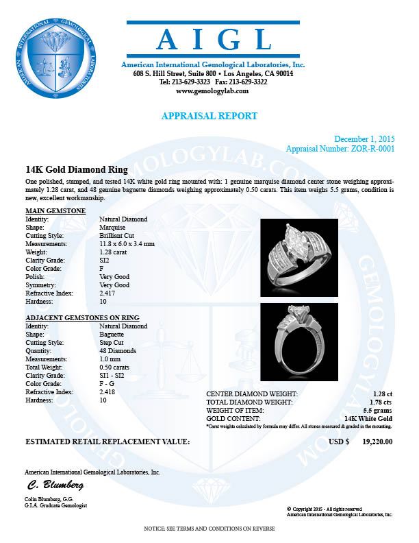 Retail: $19,220.00 ****** 14K Gold 1.78cts Diamond Ring ****** Metal: 14K Solid Gold / Total Item Weight: 5.5 grams / Country Made: United States / / Main Stone: Diamond / Carat Total Weight: 1.28 / Treatment: None / Cut: Very Good / Color Grade: F / Clarity Grade: SI2 / Cut: Marquise Brilliant / Secondary Stone: Diamond / Carat Total Weight: 0.50 / Treatment: None / Cut: Very Good / Color Grade: F - G / Clarity: SI1 - SI2 / Cut: Baguette Brilliant /