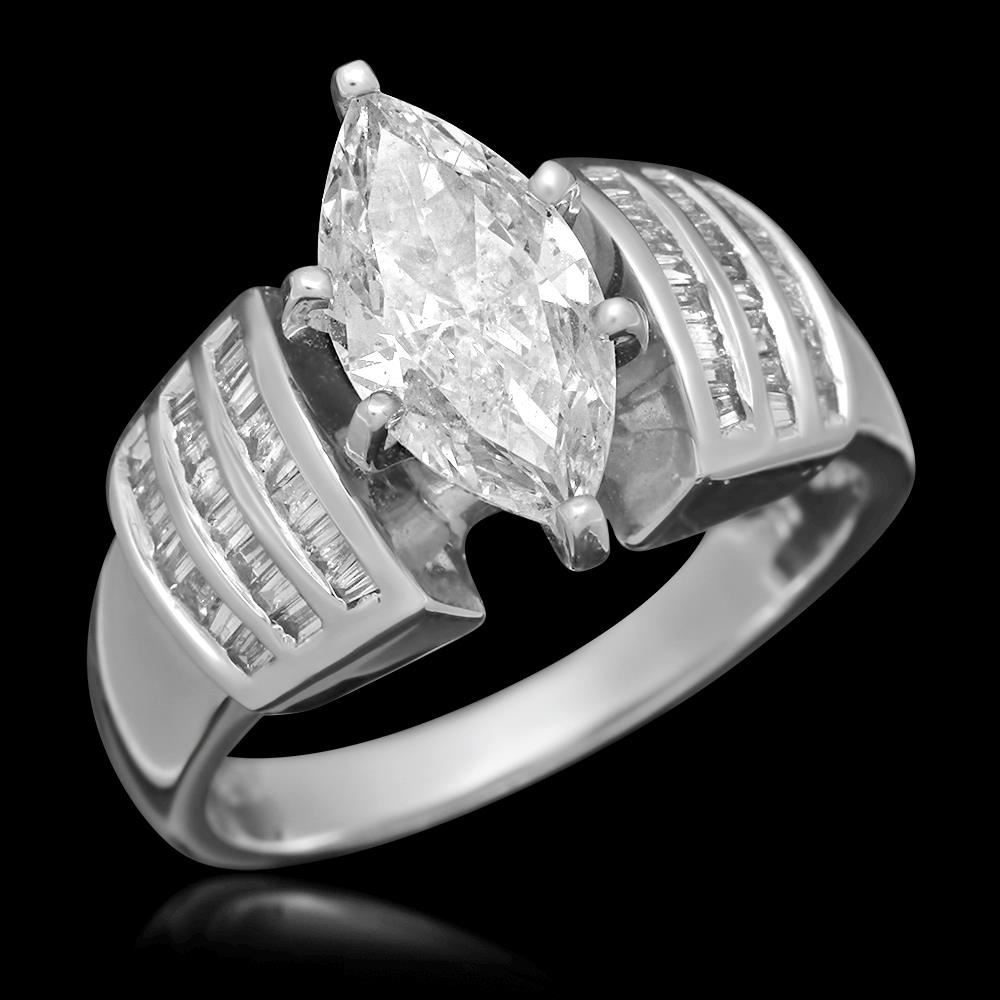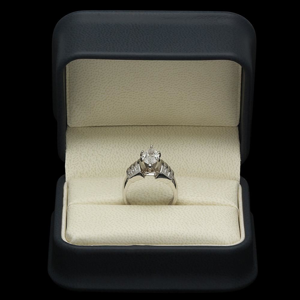 Retail: $19,220.00 ****** 14K Gold 1.78cts Diamond Ring ****** Metal: 14K Solid Gold / Total Item Weight: 5.5 grams / Country Made: United States / / Main Stone: Diamond / Carat Total Weight: 1.28 / Treatment: None / Cut: Very Good / Color Grade: F / Clarity Grade: SI2 / Cut: Marquise Brilliant / Secondary Stone: Diamond / Carat Total Weight: 0.50 / Treatment: None / Cut: Very Good / Color Grade: F - G / Clarity: SI1 - SI2 / Cut: Baguette Brilliant /