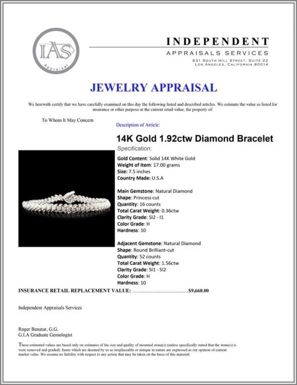 Regarding Appraised Jewelry and Loose Stones - Auctionfarm sends them out to a third party for Retail Replacement Value Appraisals, which are the most common. These types of evaluations are written for insurance needs. This would be the cost to replace the jewelry with an item of equal quality and kind, considered to be the current market price or the replacement value. This type of appraisal is done to protect you in the event of damage or loss of a valuable item. Our appraisals are conducted by independent 3rd Party appraisal firms that utilizes Certified GIA Gemologist. Appraisals should be used for verification of gemstone and/or metal weight, size, and grade only, not actual value. Appraisal value should be considered for insurance purposes only, not actual value, as price varies greatly from retail locations thru out the world. Items should not be purchased with the expectation to resell for appraisal price, or for profit.