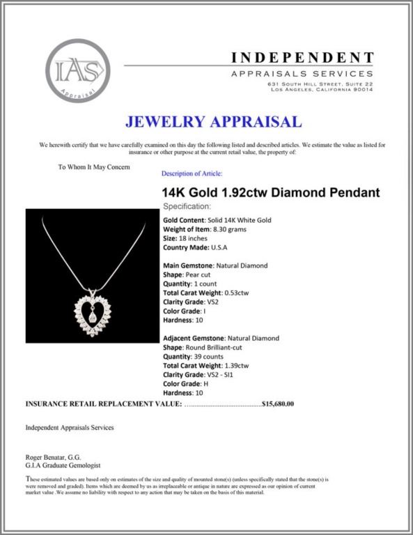 Regarding Appraised Jewelry and Loose Stones - Auctionfarm sends them out to a third party for Retail Replacement Value Appraisals, which are the most common. These types of evaluations are written for insurance needs. This would be the cost to replace the jewelry with an item of equal quality and kind, considered to be the current market price or the replacement value. This type of appraisal is done to protect you in the event of damage or loss of a valuable item. Our appraisals are conducted by independent 3rd Party appraisal firms that utilizes Certified GIA Gemologist. Appraisals should be used for verification of gemstone and/or metal weight, size, and grade only, not actual value. Appraisal value should be considered for insurance purposes only, not actual value, as price varies greatly from retail locations thru out the world. Items should not be purchased with the expectation to resell for appraisal price, or for profit.