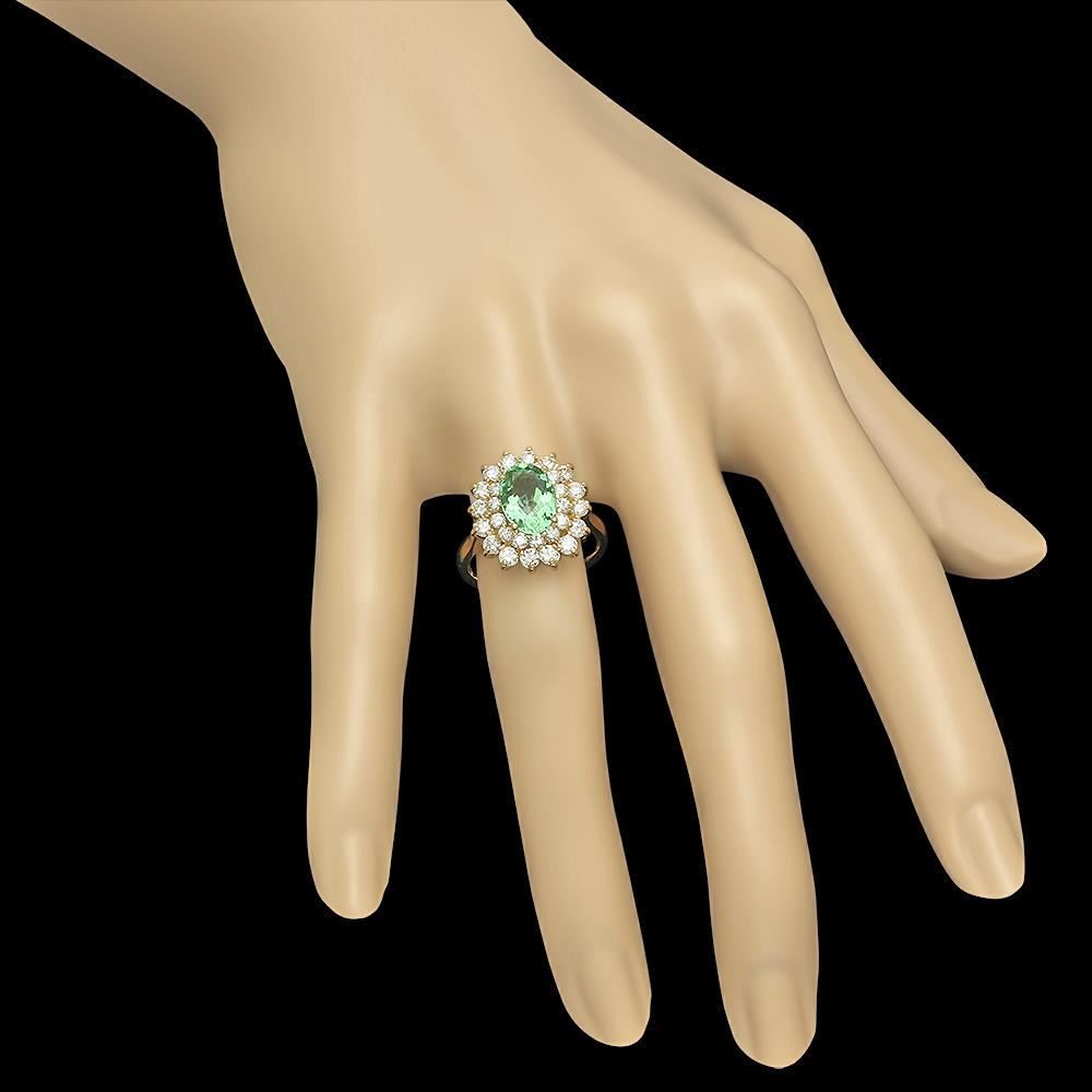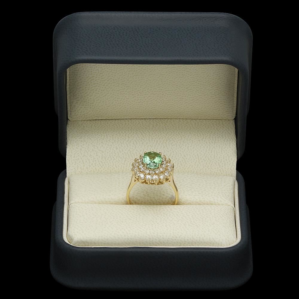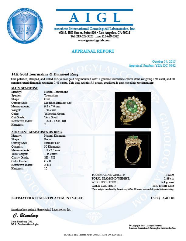 Retail: $6,410.00 ****** 14K Gold 1.94ct Tourmaline 1.45ct Diamond Ring ****** Metal: 14K Solid Gold / Total Item Weight: 5.4 grams / Country Made: United States / / Main Stone: Tourmaline / Color: Yellowish Green / Carat Total Weight: 1.94 / Treatment: None / Cut: Very Good / / Secondary Stone: Diamond / Carat Total Weight: 1.45 / Treatment: None / Color Grade: G - H / Clarity: SI1 - SI2 / Cut: Round Brilliant /