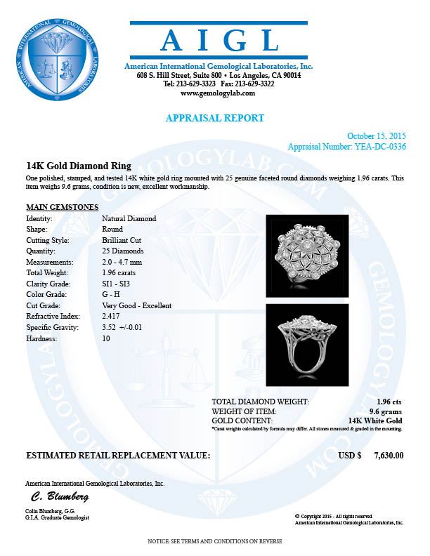 All jewelry items sold by JewelMonster are evaluated by third party appraisal firms where certified GIA Gemologists evaluate the weight, size, and grade of gemstone and/or metal to determine the replacement value of the item. Please be advised that all appraisals are done for insurance purposes only and do not determine the actual value of the jewelry on auction. The appraisals are done for sole purpose of protecting the Buyer in the event of damage or loss of purchased jewelry items from JewelMonster. JewelMonster is not responsible for the opinions and appraisals of any third party appraisal firms and their experts.