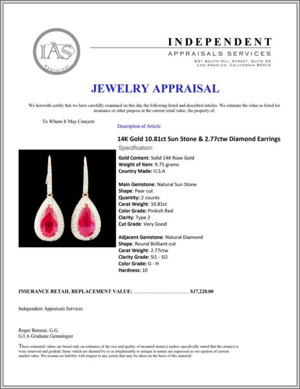 Regarding Appraised Jewelry and Loose Stones - Auctionfarm sends them out to a third party for Retail Replacement Value Appraisals, which are the most common. These types of evaluations are written for insurance needs. This would be the cost to replace the jewelry with an item of equal quality and kind, considered to be the current market price or the replacement value. This type of appraisal is done to protect you in the event of damage or loss of a valuable item. Our appraisals are conducted by independent 3rd Party appraisal firms that utilizes Certified GIA Gemologist. Appraisals should be used for verification of gemstone and/or metal weight, size, and grade only, not actual value. Appraisal value should be considered for insurance purposes only, not actual value, as price varies greatly from retail locations thru out the world. Items should not be purchased with the expectation to resell for appraisal price, or for profit.