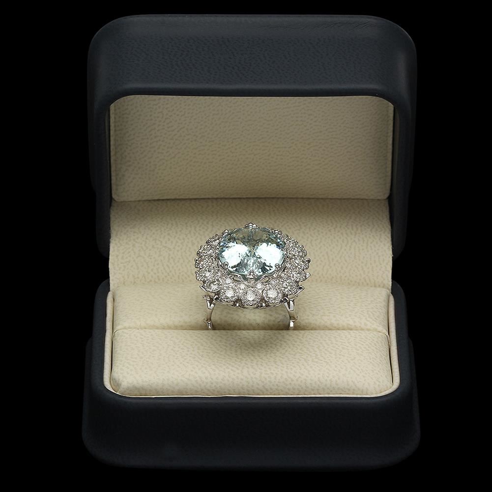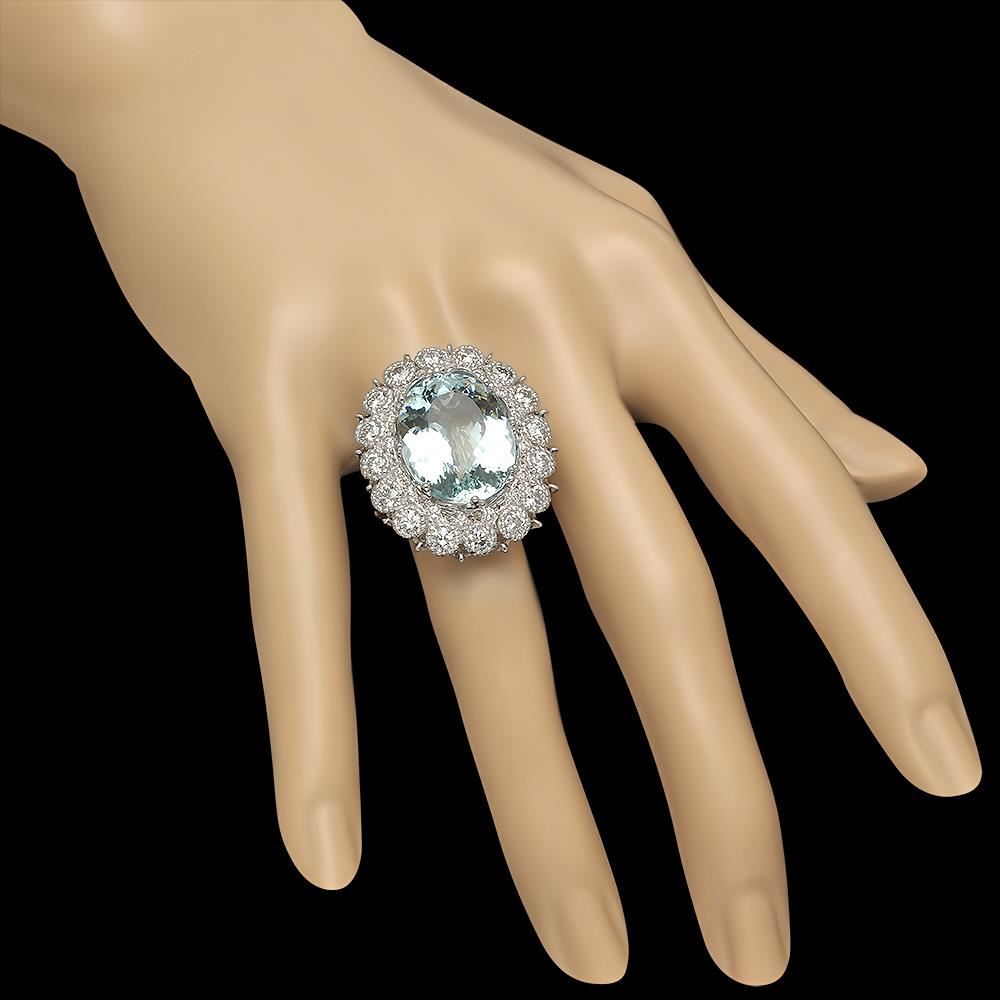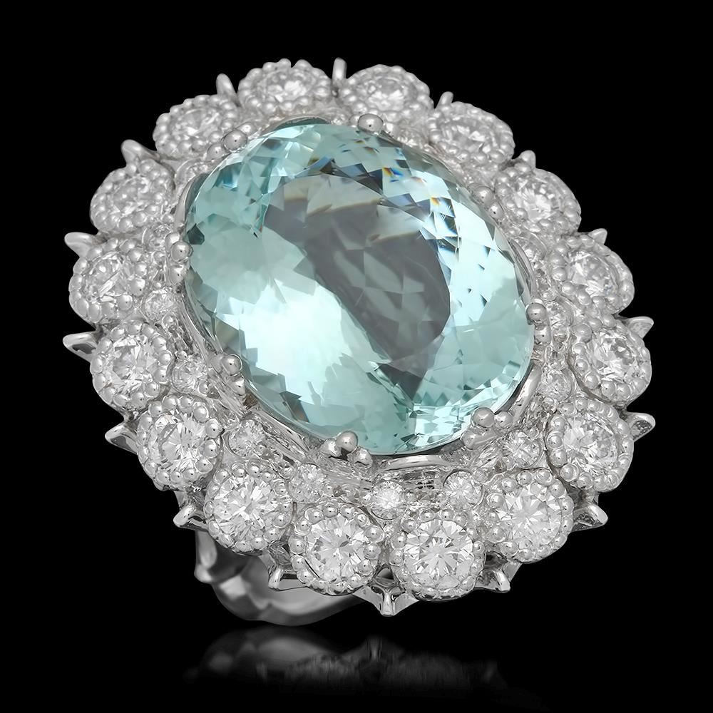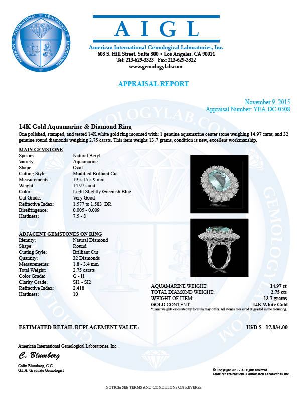 Retail: $17,834.00 ****** 14K Gold 14.97ct Aquamarine 2.75ct Diamond Ring ****** Metal: 14K Solid Gold / Total Item Weight: 13.7 grams / Country Made: United States / / Main Stone: Aquamarine / Color: Light Slightly Greenish Blue / Carat Total Weight: 14.97 / Treatment: None / Cut: Very Good / / Secondary Stone: Diamond / Carat Total Weight: 2.75 / Treatment: None / Color Grade: G - H / Clarity: SI1 - SI2 / Cut: Round Brilliant /