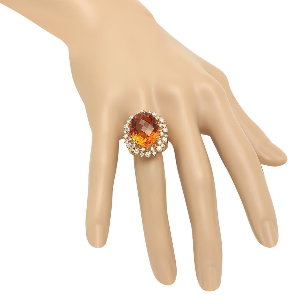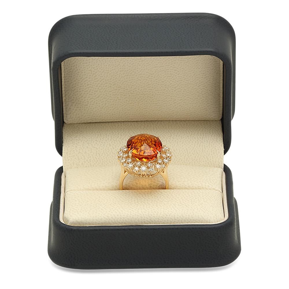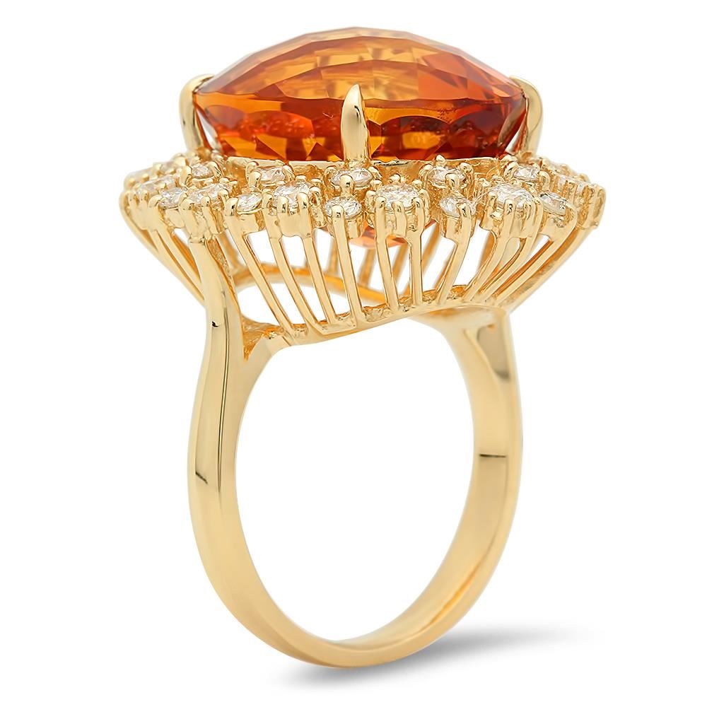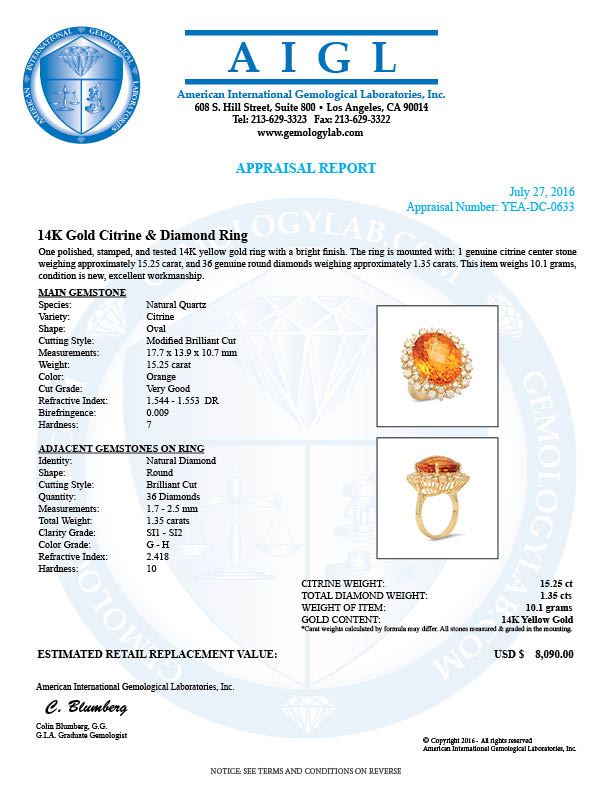 Retail: $8,090.00 ****** 14K Gold 15.25ct Citrine 1.35cts Diamond Ring ****** Metal: 14K Yellow Gold / Total Item Weight: 10.1 grams / Country Made: United States / Main Stone: Citrine / Color: Orange / Carat Total Weight: 15.25 / Treatment: None / Cut: Very Good / Secondary Stone: Diamond / Carat Total Weight: 1.35 / Treatment: None / Color Grade: G-H / Clarity: SI1 - SI2 / Cut: Round Brilliant /