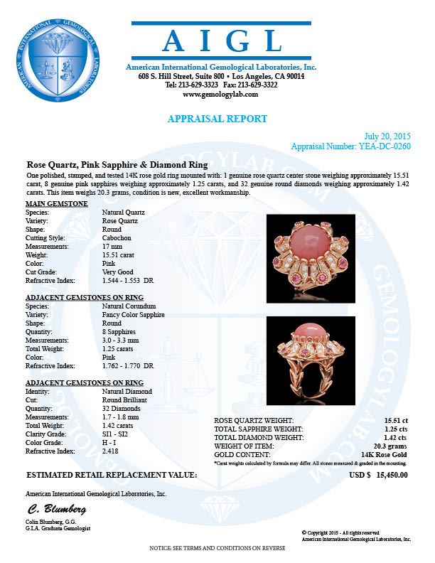 Retail: $15,450.00 ****** Rose Quartz, Pink Sapphire & Diamond Ring ****** Metal: 14K Solid White Gold / Total Item Weight: 20.3 / Country Made: United States / / Main Stone: Rose Quartz / Color: Pink / Carat Total Weight: 15.51 / Treatment: None / Clarity: Type 2 / Cut: Very Good / / Secondary Stone: Pink Sapphire / Color: Pink / Carat Total Weight: 1.25 / Treatment: None / Clarity: Type 2 / Cut: Very Good / / Diamond / Carat Total Weight: 1.42 / Treatment: None / Color Grade: H - I / Clarity: SI1 - SI2 / Cut: Round Brilliant /