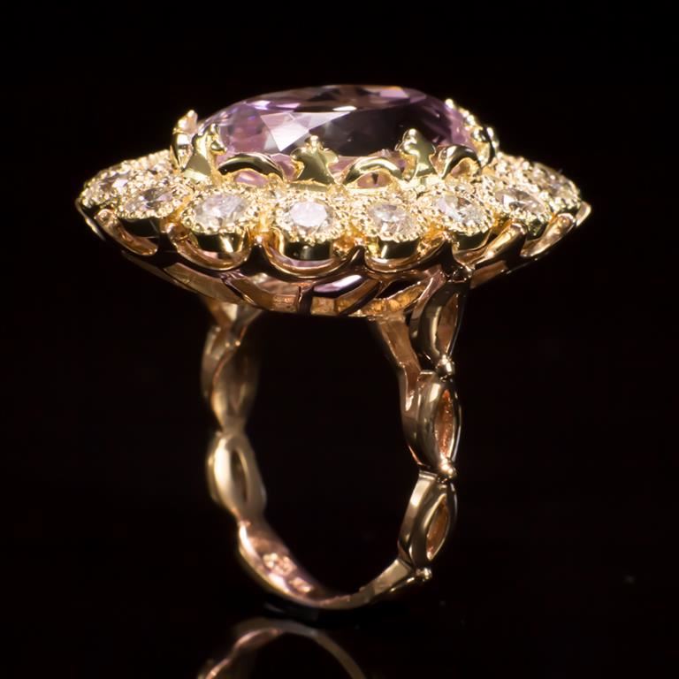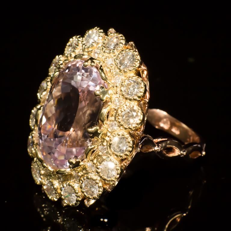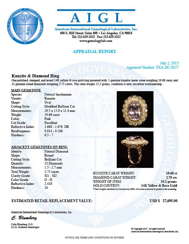 Retail: $27,695.00 ****** Kunzite & Diamond Ring ****** Metal: 14K Solid Gold / Total Item Weight: 15.2 grams / Country Made: United States / / Main Stone:Kunzite / Color: Pink / Carat Total Weight: 19.68/ Treatment: None / Clarity: Type 2 / Cut: Very Good / / Secondary Stone: Diamond / Carat Total Weight: 2.75 / Treatment: None / Color Grade: G- H / Clarity: SI1 - SI2 / Cut: Round Brilliant /