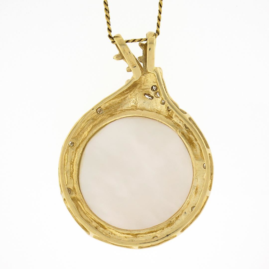 A solid 14k yellow gold pendant necklace, with 1 round shape cultured Mabe pearl (19.6mm), and 13 single cut natural diamonds (I/J Color - SI2/I1 ; 0.15ctw ). 18 inch curb link chain, 9.59 grams total weight, pendant measures 35x24.80mm.