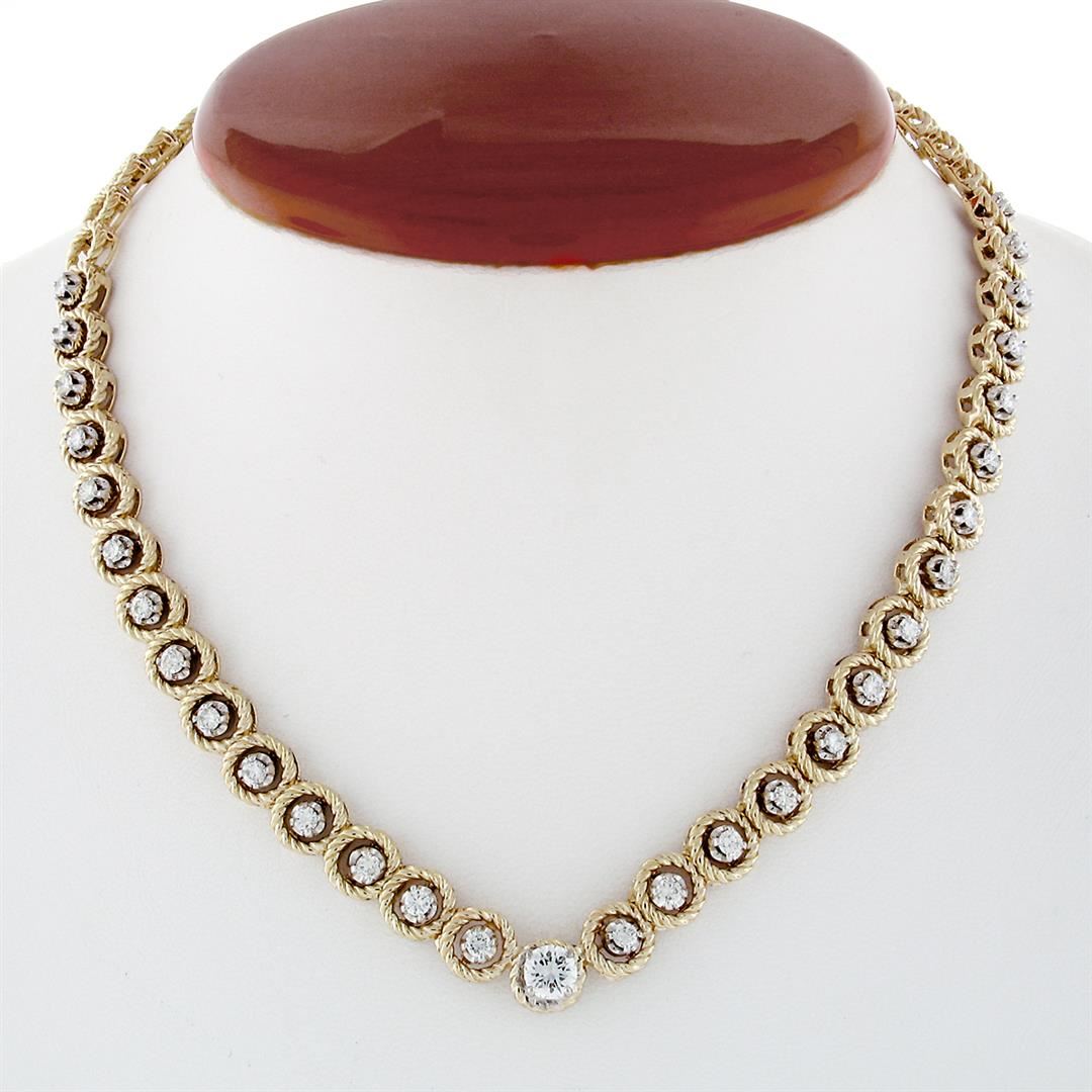 A solid 14k yellow gold choker necklace, with 1 round brilliant cut natural diamond (F - VS1 Clarity; 0.56ct), and 29 round brilliant cut natural diamonds (G/H - VS2-SI2; 1.65ctw). 15 inch twisted cable circle link chain, 48.03 grams total weight.