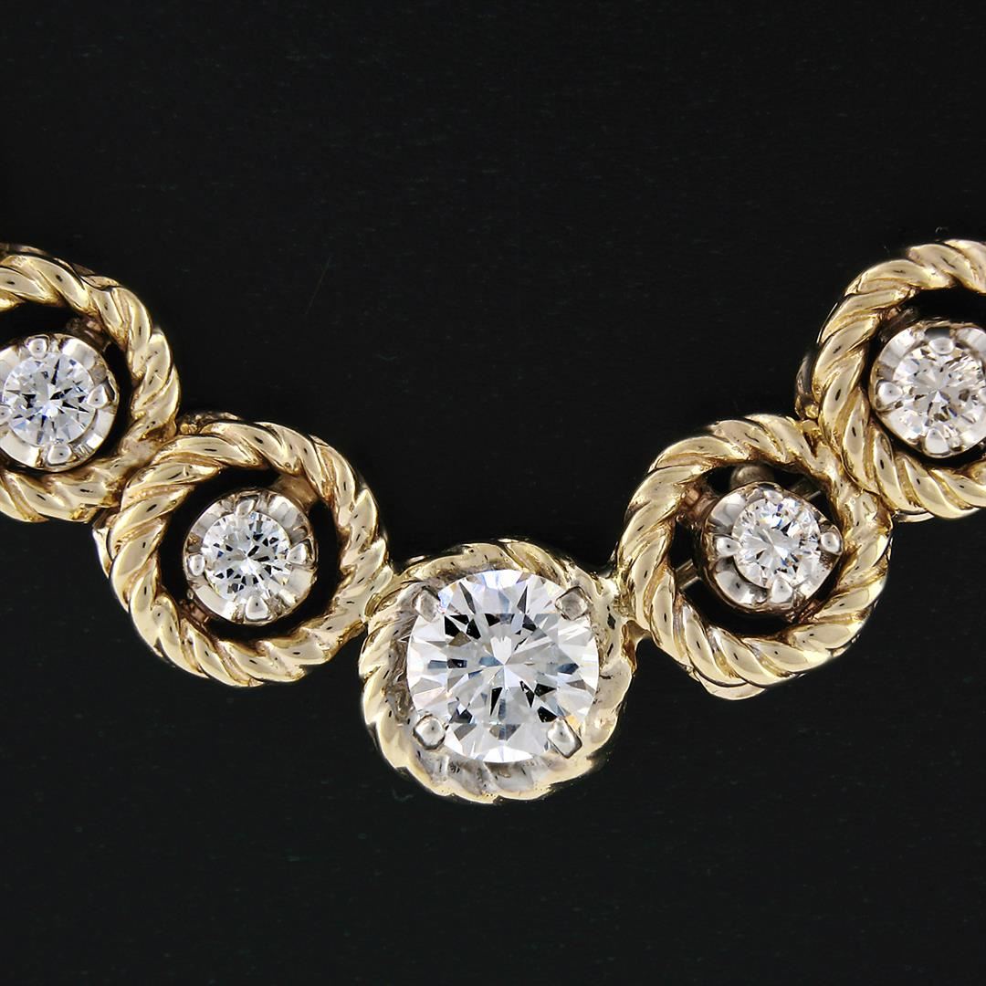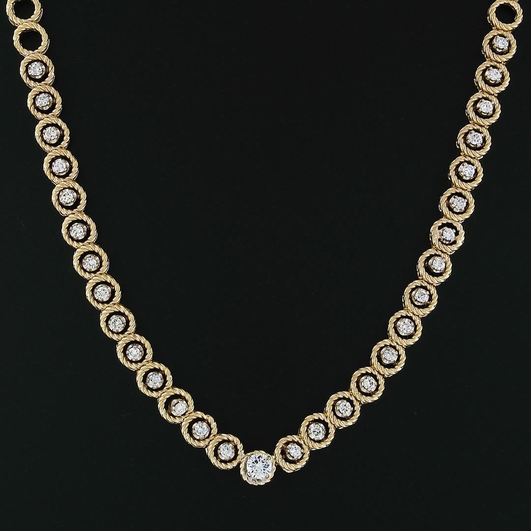 A solid 14k yellow gold choker necklace, with 1 round brilliant cut natural diamond (F - VS1 Clarity; 0.56ct), and 29 round brilliant cut natural diamonds (G/H - VS2-SI2; 1.65ctw). 15 inch twisted cable circle link chain, 48.03 grams total weight.