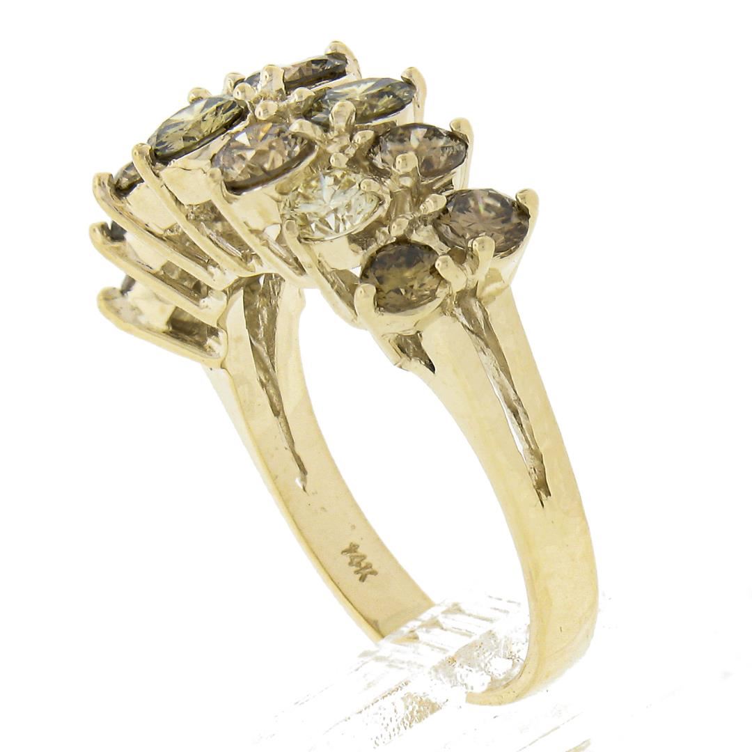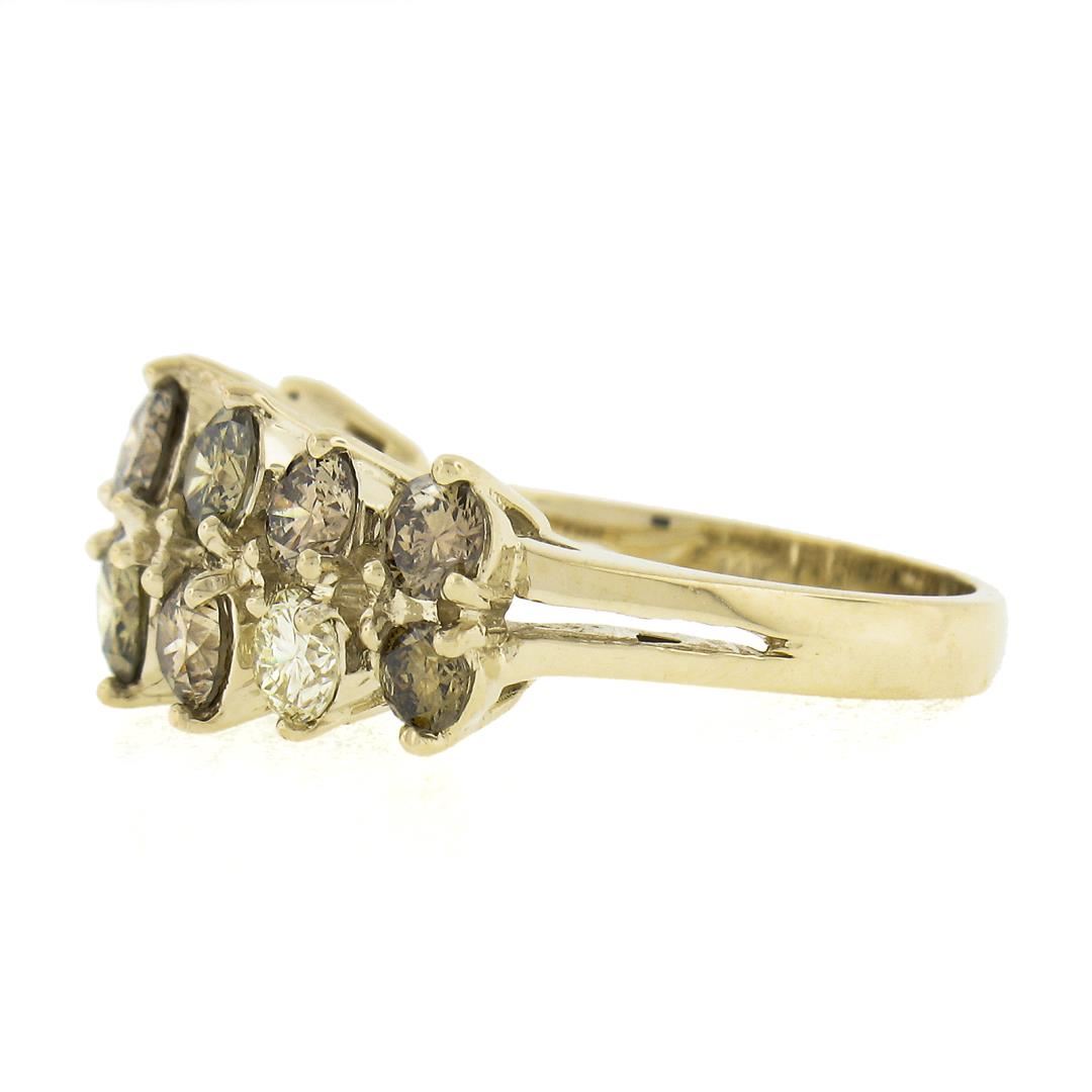 A solid 14k yellow gold 2 row band ring, with 14 round cut fancy colors natural diamonds (VS2-SI2 ; 2.24ctw). The ring is size 6.5, weighs a total of 4.47 grams, and measures 9.2mm wide.