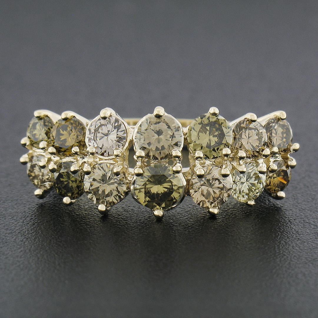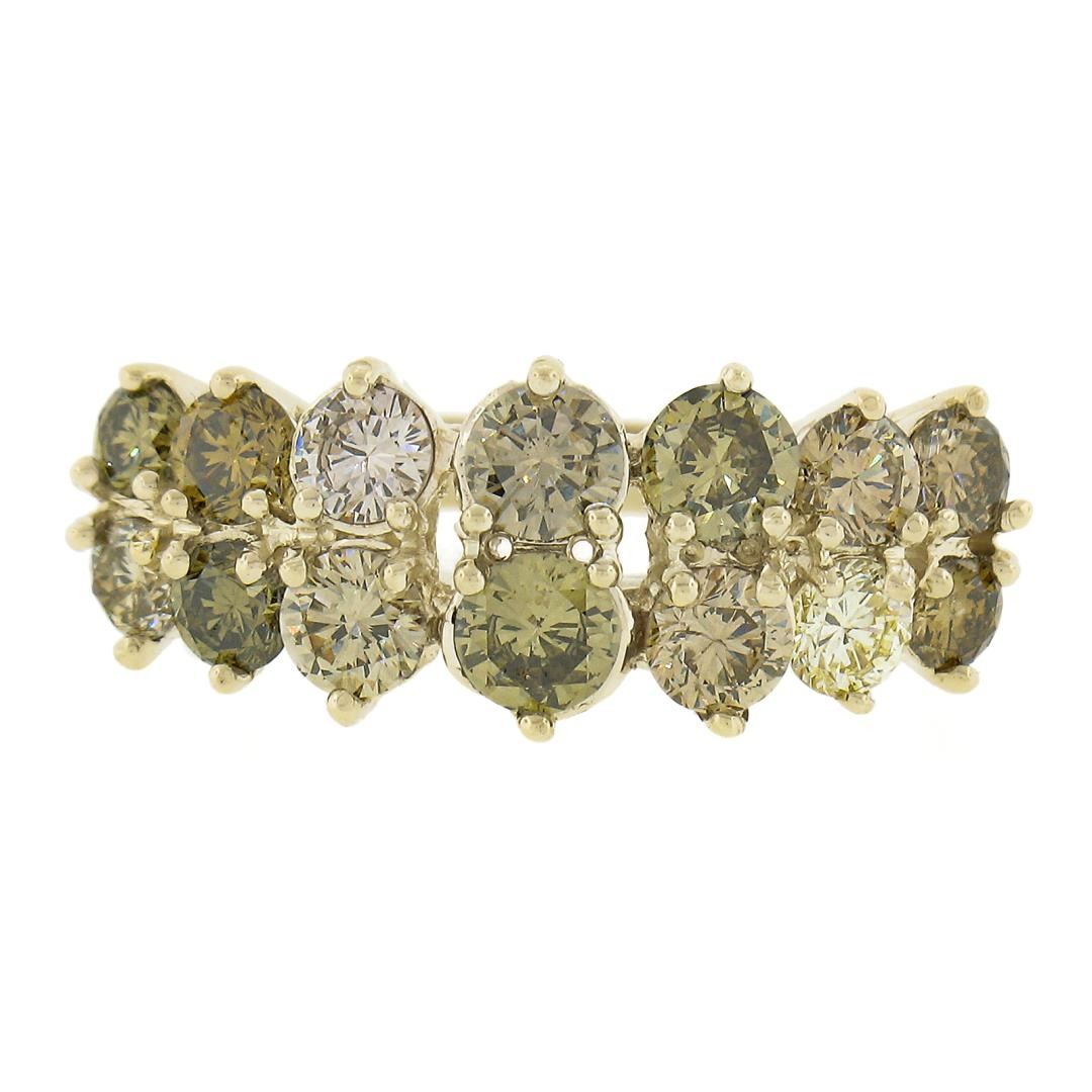 A solid 14k yellow gold 2 row band ring, with 14 round cut fancy colors natural diamonds (VS2-SI2 ; 2.24ctw). The ring is size 6.5, weighs a total of 4.47 grams, and measures 9.2mm wide.