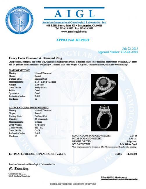 Retail: $12,035.00 ******14K Gold Fancy Color Diamond & Diamond Ring ****** Metal: 14K Solid White Gold / Total Item Weight: 4.5 grams / Country Made: United States / / Main Stone: Diamond / Color: Fancy Black/ Carat Total Weight: 2.24 / Treatment: None / Clarity: Type 2 / Cut: Very Good / / Secondary Stone: Diamond / Carat Total Weight: 3.77 / Treatment: None / Color Grade: G - H / Clarity: SI1 - SI2 / Cut: Round Brilliant /