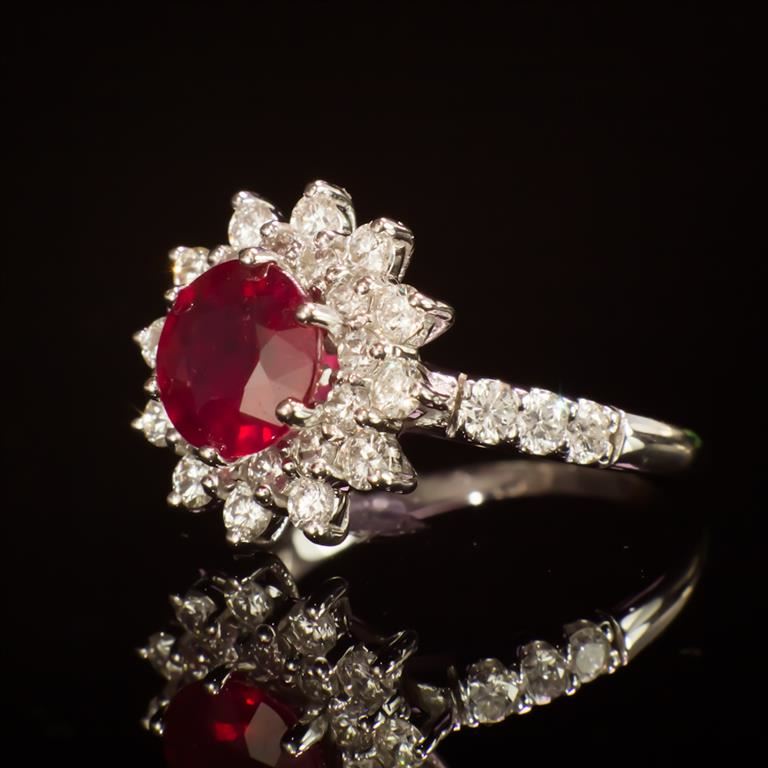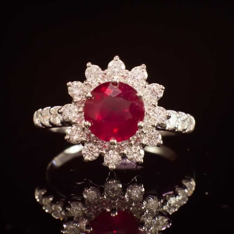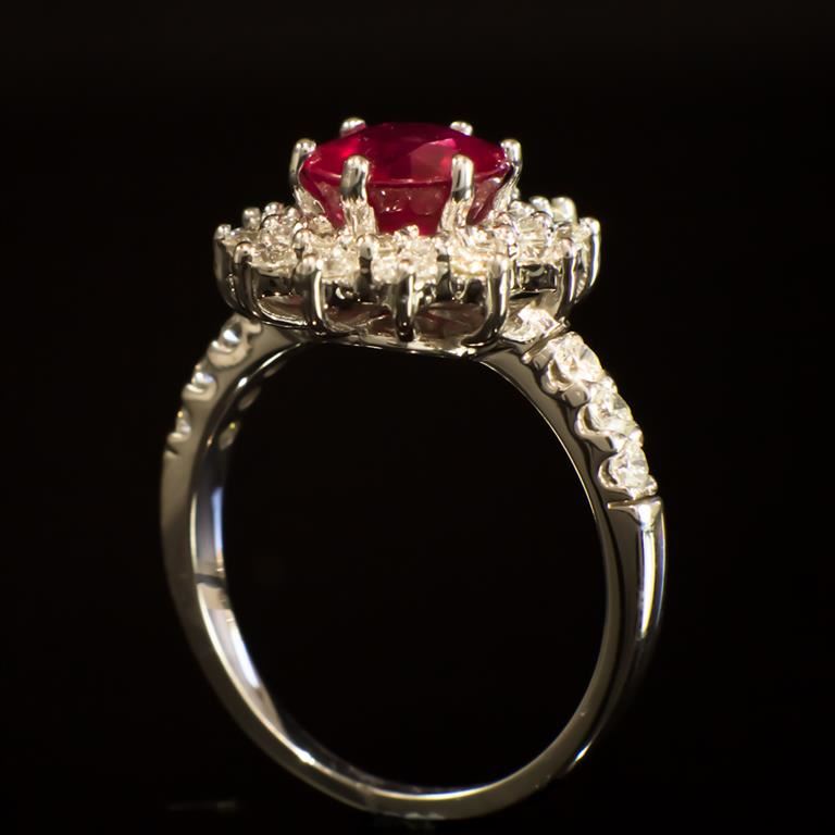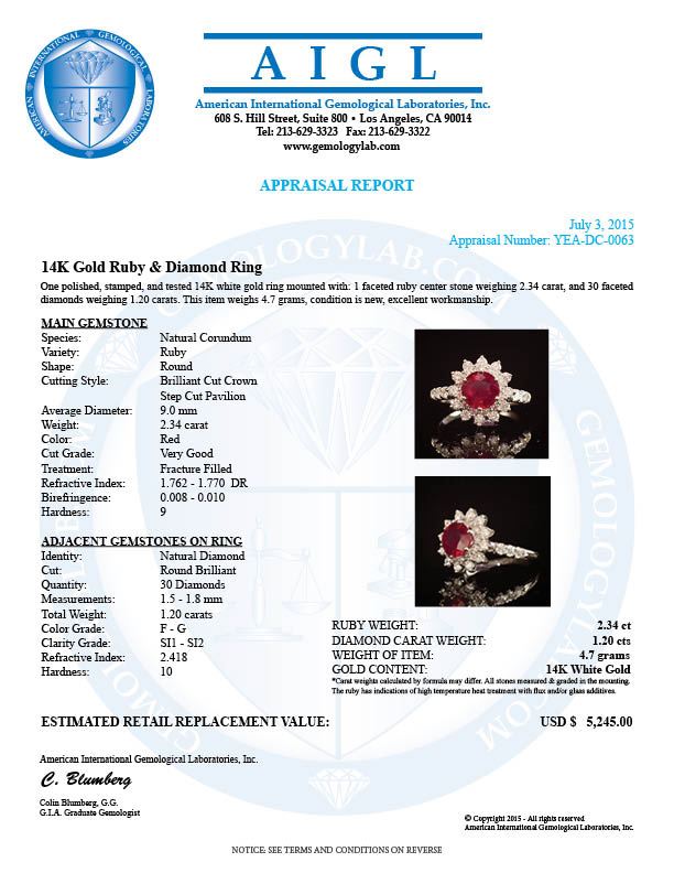Retail: $5,245.00 ******14K Gold Ruby & Diamond Ring ****** Metal: 14K Solid White Gold / Total Item Weight: 4.7 grams / Country Made: United States /  / Main Stone: Ruby / Color: Red / Carat Total Weight: 2.34 / Treatment: None / Clarity: Type 2 / Cut: Very Good /  / Secondary Stone: Diamond / Carat Total Weight: 1.20  / Treatment: None / Color Grade: F - G / Clarity: SI1 - SI2  / Cut: Round Brilliant /