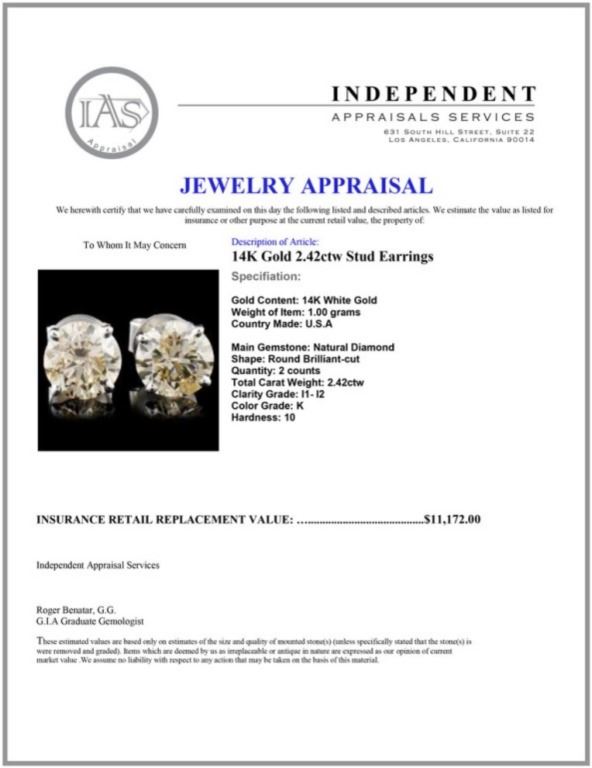 Regarding Appraised Jewelry and Loose Stones - Auctionfarm sends them out to a third party for Retail Replacement Value Appraisals, which are the most common. These types of evaluations are written for insurance needs. This would be the cost to replace the jewelry with an item of equal quality and kind, considered to be the current market price or the replacement value. This type of appraisal is done to protect you in the event of damage or loss of a valuable item. Our appraisals are conducted by independent 3rd Party appraisal firms that utilizes Certified GIA Gemologist. Appraisals should be used for verification of gemstone and/or metal weight, size, and grade only, not actual value. Appraisal value should be considered for insurance purposes only, not actual value, as price varies greatly from retail locations thru out the world. Items should not be purchased with the expectation to resell for appraisal price, or for profit.