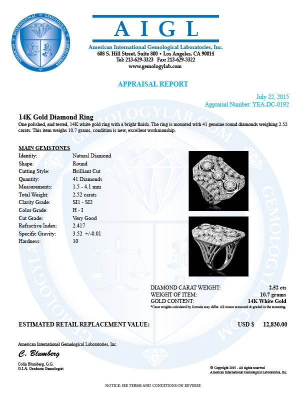 Retail: $12,830.00 ******14k Gold Diamond Ring****** Metal: 14K Solid White Gold / Total Item Weight: 10.7 grams / Country Made: United States / / Main Stone: Diamond / Carat Total Weight: 2.52 / Treatment: None / Color Grade: H - I / Clarity: SI1 - SI2 / Cut: Round Brilliant /