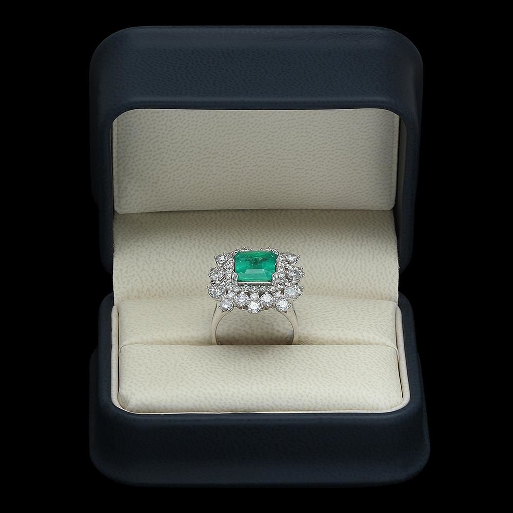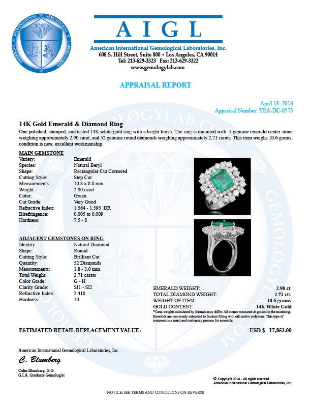 Retail: $17,853.00 ******14K Gold 2.90 Emerald 2.71 Diamond Ring ****** Metal: 14K Solid Gold / Total Item Weight: 10.6 grams / Country Made: United States / / Main Stone: Emerald / Color: Green / Carat Total Weight: 2.90 / Treatment: None / Cut: Very Good / / Secondary Stone: Diamond / Carat Total Weight: 2.71 / Treatment: None / Color Grade: G - H / Clarity: SI1 - SI2 / Cut: Round Brilliant /