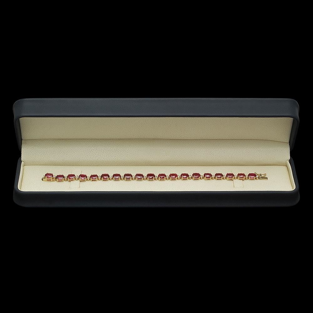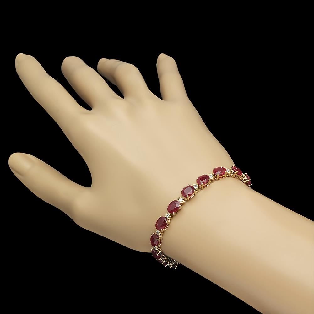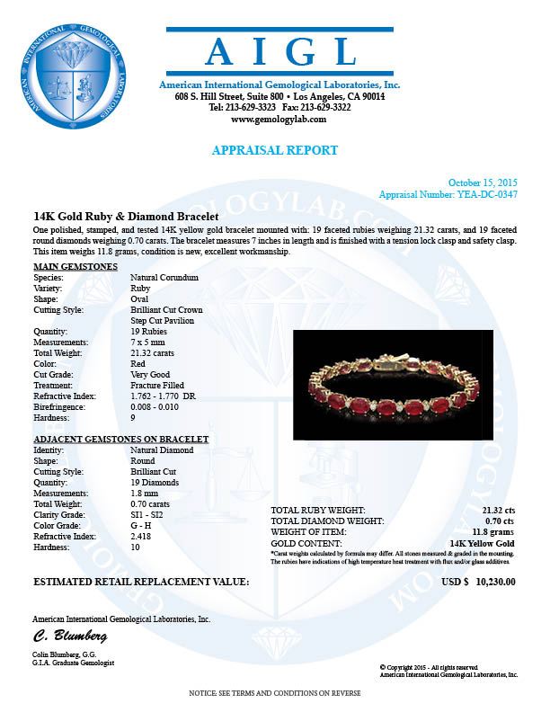 Retail: $10,230.00 ****** 14K Gold 21.32ct Ruby 0.70ct Diamond Bracelet ****** Metal: 14K Solid Gold / Total Item Weight: 11.8 grams / Country Made: United States / / Main Stone: Ruby / Color: Red / Carat Total Weight: 21.32 / Treatment: None / Cut: Very Good / / Secondary Stone: Diamond / Carat Total Weight: 0.70 / Treatment: None / Color Grade: G - H / Clarity: SI1 - SI3 / Cut: Round Brilliant /