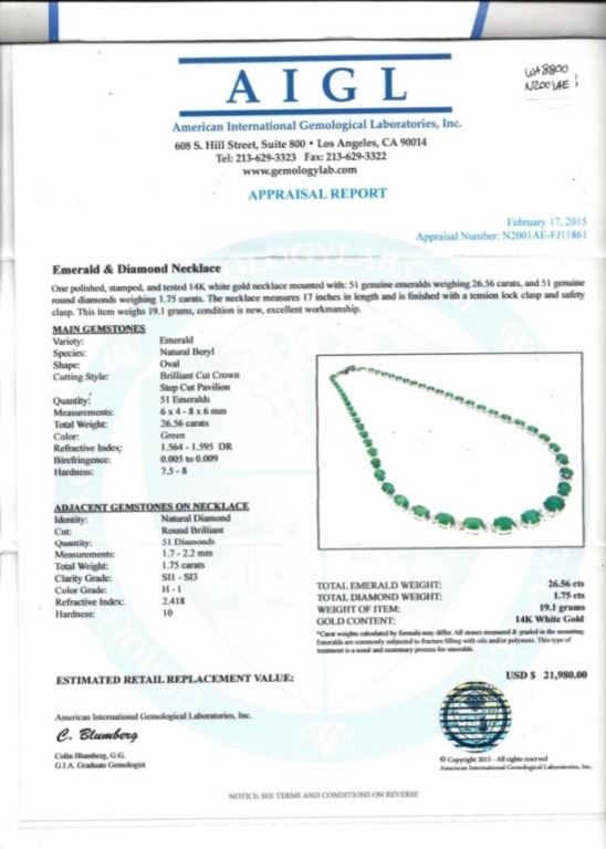 Regarding Appraised Jewelry and Loose Stones - Auctionfarm sends them out to a third party for Retail Replacement Value Appraisals, which are the most common. These types of evaluations are written for insurance needs. This would be the cost to replace the jewelry with an item of equal quality and kind, considered to be the current market price or the replacement value. This type of appraisal is done to protect you in the event of damage or loss of a valuable item. Our appraisals are conducted by independent 3rd Party appraisal firms that utilizes Certified GIA Gemologist. Appraisals should be used for verification of gemstone and/or metal weight, size, and grade only, not actual value. Appraisal value should be considered for insurance purposes only, not actual value, as price varies greatly from retail locations thru out the world. Items should not be purchased with the expectation to resell for appraisal price, or for profit.