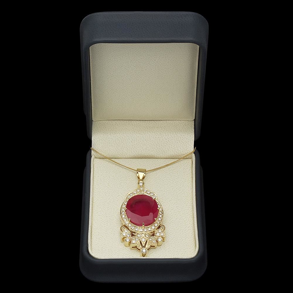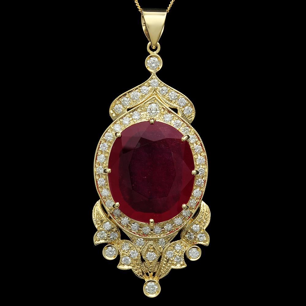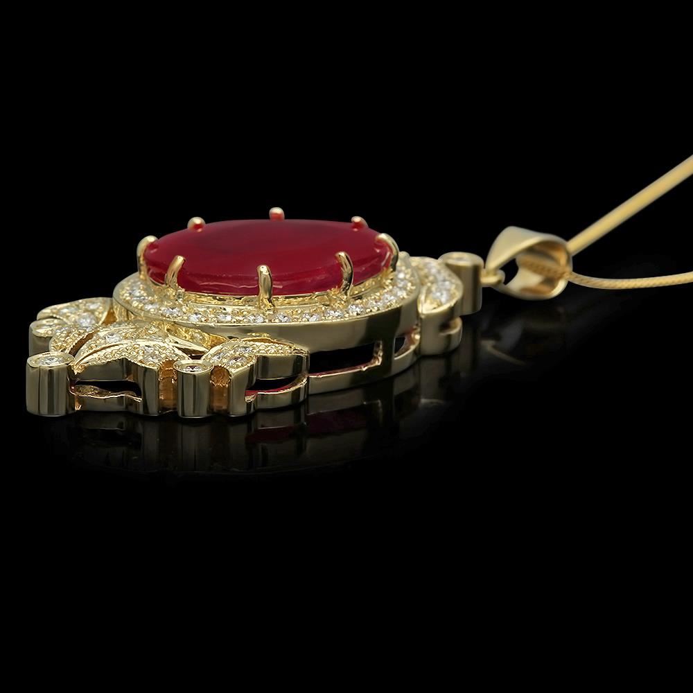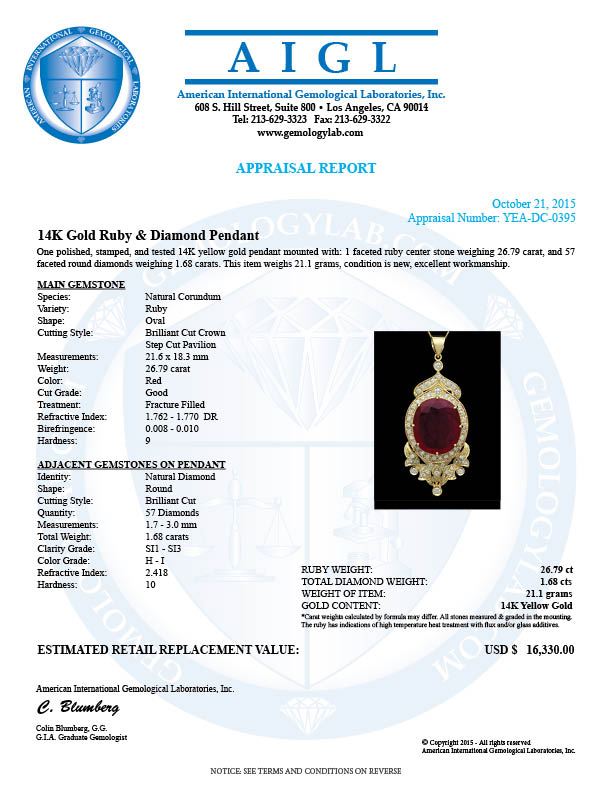 Retail: $16,330.00 ****** 14K Gold 26.79ct Ruby 1.68ct Diamond Pendant ****** Metal: 14K Solid Gold / Total Item Weight: 21.1 grams / Country Made: United States / / Main Stone: Ruby / Color: Red / Carat Total Weight: 26.79 / Treatment: None / Cut: Good / / Secondary Stone: Diamond / Carat Total Weight: 1.68 / Treatment: None / Color Grade: H - I / Clarity: SI1 - SI3 / Cut: Round Brilliant /