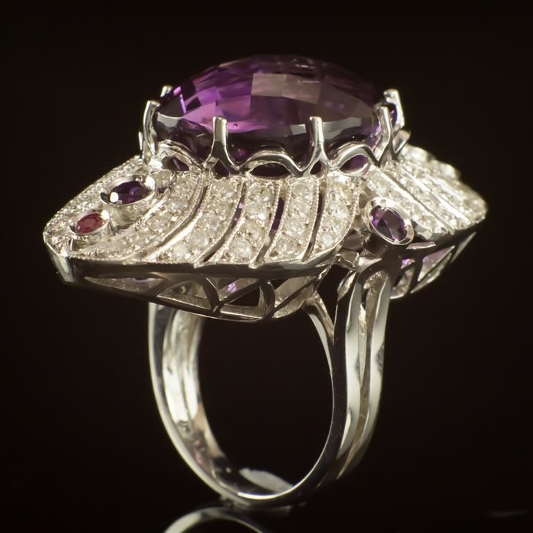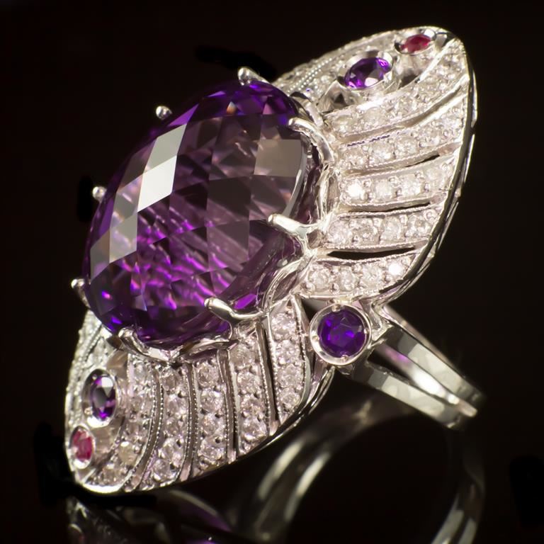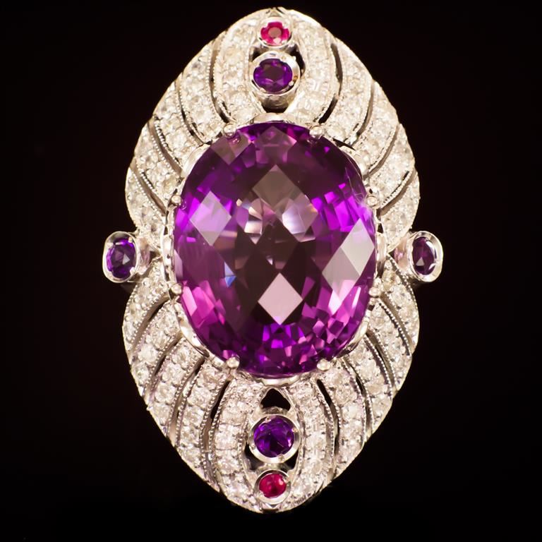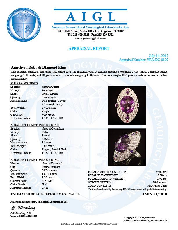 Retail:$14,750.00******Amethyst, Ruby & Diamond Ring   ****** Metal: 14K Solid White Gold / Total Item Weight: 18.6 grams / Country Made: United States /  / Main Stone: Amethyst / Color: Purple / Carat Total Weight: 27.00 / Treatment: None / Clarity: Type 2 / Cut: Very Good /  / Secondary Stone: Ruby / Color: Slight Pinkish Red / Carat Total Weight: 0.08 / Treatment: None / Clarity: Type 2 / Cut: Very Good / / Third Stone: Diamond / Carat Total Weight: 1.70 / Treatment: None / Color Grade  H - I   / Clarity: SI1 - SI3 / Cut: Round Brilliant /