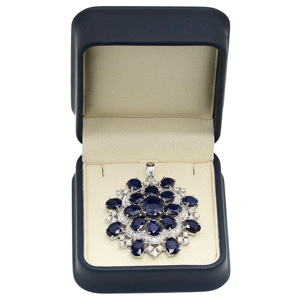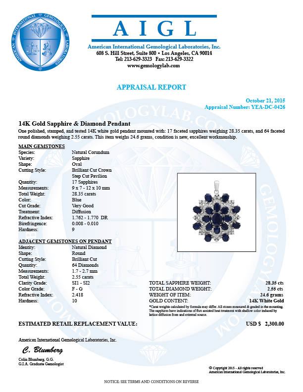 Retail: $2,300.00 ****** 14K Gold 28.35ct Sapphire 2.55ct Diamond Pendant ****** Metal: 14K Solid Gold / Total Item Weight: 24.6 grams / Country Made: United States / / Main Stone: Sapphire / Color: Blue / Carat Total Weight: 28.35 / Treatment: None / Cut: Very Good / / Secondary Stone: Diamond / Carat Total Weight: 2.55 / Treatment: None / Color Grade: F - G / Clarity: SI1 - SI2 / Cut: Round Brilliant /