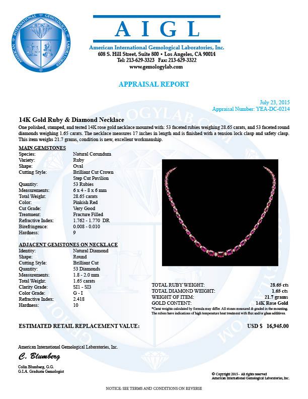 Retail: $16,945.00******14K Gold Ruby & Diamond Necklace****** Metal: 14K Solid Rose Gold / Total Item Weight: 21.7 grams/ Country Made: United States / / Main Stone: Ruby / Color: Pinkish Red / Carat Total Weight: 28.65 / Treatment: None / Clarity: Type 2 / Cut: Very Good / / Secondary Stone: Diamond / Carat Total Weight: 1.65 / Treatment: None / Color Grade: G -I / Clarity: SI1 - SI3 / Cut: Round Brilliant /