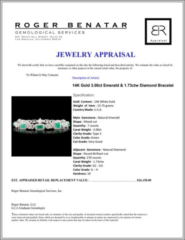 Regarding Appraised Jewelry and Loose Stones - Auctionfarm sends them out to a third party for Retail Replacement Value Appraisals, which are the most common. These types of evaluations are written for insurance needs. This would be the cost to replace the jewelry with an item of equal quality and kind, considered to be the current market price or the replacement value. This type of appraisal is done to protect you in the event of damage or loss of a valuable item. Our appraisals are conducted by independent 3rd Party appraisal firms that utilizes Certified GIA Gemologist. Appraisals should be used for verification of gemstone and/or metal weight, size, and grade only, not actual value. Appraisal value should be considered for insurance purposes only, not actual value, as price varies greatly from retail locations thru out the world. Items should not be purchased with the expectation to resell for appraisal price, or for profit.