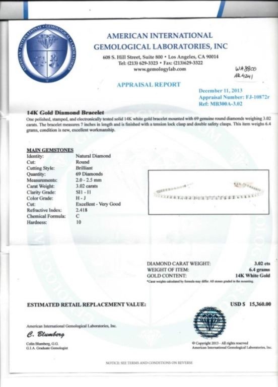 Regarding Appraised Jewelry and Loose Stones - Auctionfarm sends them out to a third party for Retail Replacement Value Appraisals, which are the most common. These types of evaluations are written for insurance needs. This would be the cost to replace the jewelry with an item of equal quality and kind, considered to be the current market price or the replacement value. This type of appraisal is done to protect you in the event of damage or loss of a valuable item. Our appraisals are conducted by independent 3rd Party appraisal firms that utilizes Certified GIA Gemologist. Appraisals should be used for verification of gemstone and/or metal weight, size, and grade only, not actual value. Appraisal value should be considered for insurance purposes only, not actual value, as price varies greatly from retail locations thru out the world. Items should not be purchased with the expectation to resell for appraisal price, or for profit.