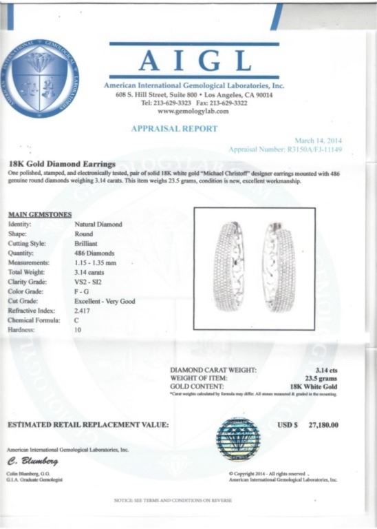 Regarding Appraised Jewelry and Loose Stones - Auctionfarm sends them out to a third party for Retail Replacement Value Appraisals, which are the most common. These types of evaluations are written for insurance needs. This would be the cost to replace the jewelry with an item of equal quality and kind, considered to be the current market price or the replacement value. This type of appraisal is done to protect you in the event of damage or loss of a valuable item. Our appraisals are conducted by independent 3rd Party appraisal firms that utilizes Certified GIA Gemologist. Appraisals should be used for verification of gemstone and/or metal weight, size, and grade only, not actual value. Appraisal value should be considered for insurance purposes only, not actual value, as price varies greatly from retail locations thru out the world. Items should not be purchased with the expectation to resell for appraisal price, or for profit.