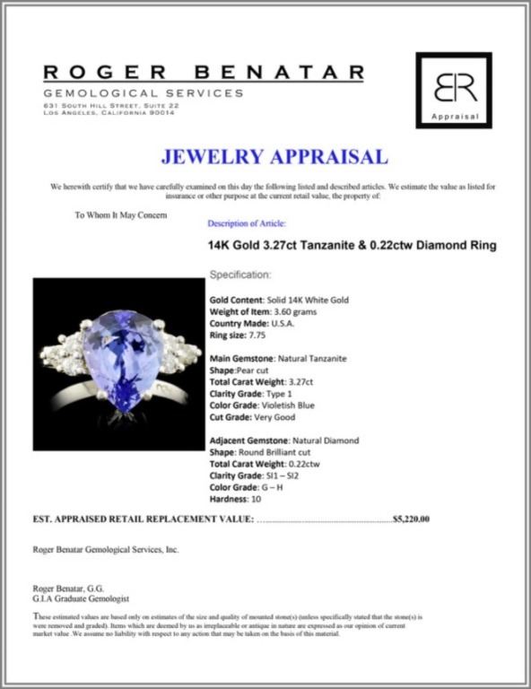 Regarding Appraised Jewelry and Loose Stones - Auctionfarm sends them out to a third party for Retail Replacement Value Appraisals, which are the most common. These types of evaluations are written for insurance needs. This would be the cost to replace the jewelry with an item of equal quality and kind, considered to be the current market price or the replacement value. This type of appraisal is done to protect you in the event of damage or loss of a valuable item. Our appraisals are conducted by independent 3rd Party appraisal firms that utilizes Certified GIA Gemologist. Appraisals should be used for verification of gemstone and/or metal weight, size, and grade only, not actual value. Appraisal value should be considered for insurance purposes only, not actual value, as price varies greatly from retail locations thru out the world. Items should not be purchased with the expectation to resell for appraisal price, or for profit.