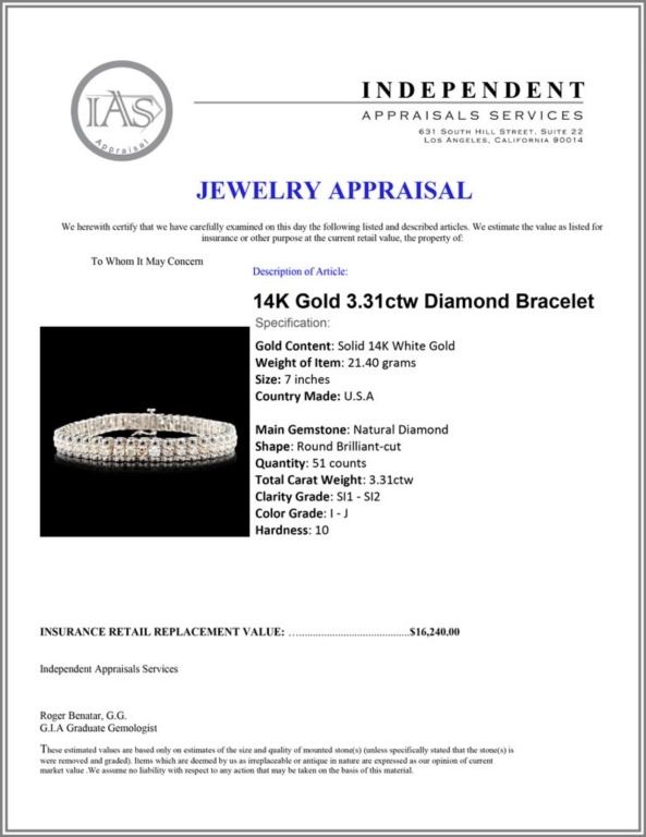 Regarding Appraised Jewelry and Loose Stones - Auctionfarm sends them out to a third party for Retail Replacement Value Appraisals, which are the most common. These types of evaluations are written for insurance needs. This would be the cost to replace the jewelry with an item of equal quality and kind, considered to be the current market price or the replacement value. This type of appraisal is done to protect you in the event of damage or loss of a valuable item. Our appraisals are conducted by independent 3rd Party appraisal firms that utilizes Certified GIA Gemologist. Appraisals should be used for verification of gemstone and/or metal weight, size, and grade only, not actual value. Appraisal value should be considered for insurance purposes only, not actual value, as price varies greatly from retail locations thru out the world. Items should not be purchased with the expectation to resell for appraisal price, or for profit.