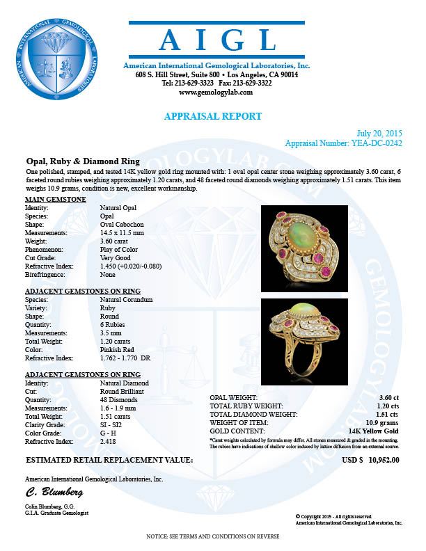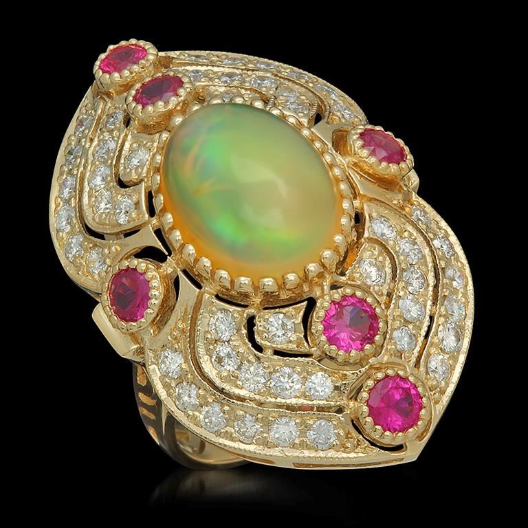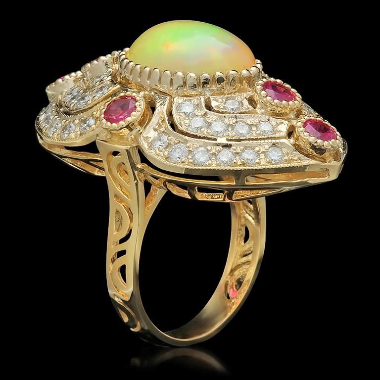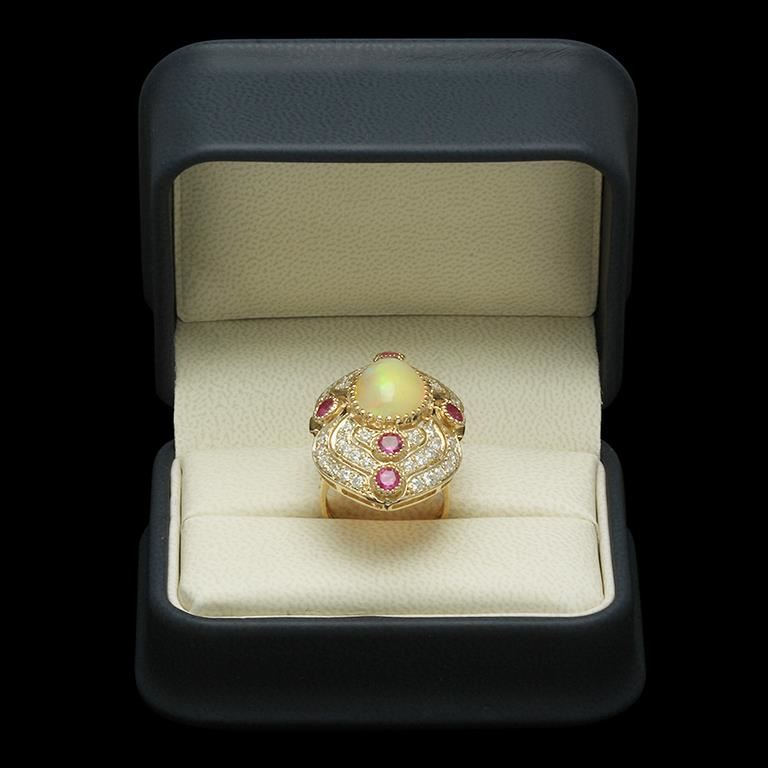 Retail: $10,952.00 ****** Opal, Ruby & Diamond Ring ****** Metal: 14K Solid Yellow Gold / Total Item Weight: 10.9 / Country Made: United States / / Main Stone: Opal / Color: Play of Color / Carat Total Weight: 3.60 / Treatment: None / Clarity: Type 2 / Cut: Very Good / / Secondary Stone: Ruby / Color: Pinkish Red / Carat Total Weight: 1.20 / Treatment: None / Clarity: Type 2 / Cut: Very Good / / Third Stone: Diamond / Carat Total Weight: 1.51 / Treatment: None / Color Grade: G - H / Clarity: SI1 - SI2 / Cut: Round Brilliant /
