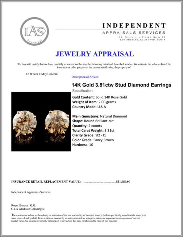 Regarding Appraised Jewelry and Loose Stones - Auctionfarm sends them out to a third party for Retail Replacement Value Appraisals, which are the most common. These types of evaluations are written for insurance needs. This would be the cost to replace the jewelry with an item of equal quality and kind, considered to be the current market price or the replacement value. This type of appraisal is done to protect you in the event of damage or loss of a valuable item. Our appraisals are conducted by independent 3rd Party appraisal firms that utilizes Certified GIA Gemologist. Appraisals should be used for verification of gemstone and/or metal weight, size, and grade only, not actual value. Appraisal value should be considered for insurance purposes only, not actual value, as price varies greatly from retail locations thru out the world. Items should not be purchased with the expectation to resell for appraisal price, or for profit.