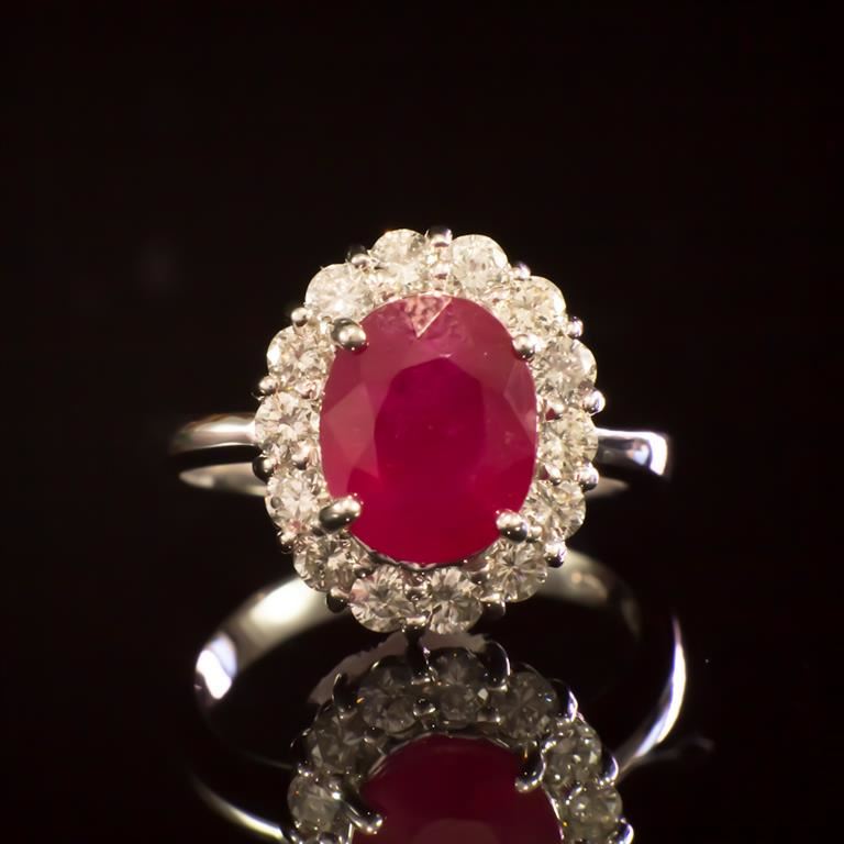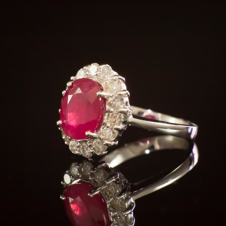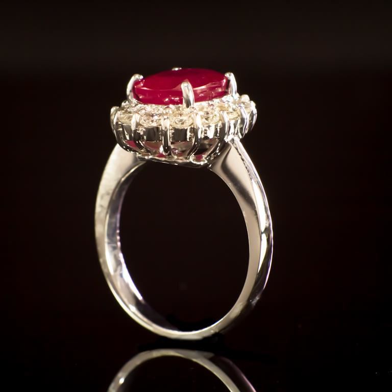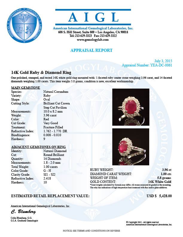 Retail: $5,428.00 ******14K Gold Ruby & Diamond Ring ****** Metal: 14K Solid White Gold / Total Item Weight: 5.8 grams / Country Made: United States / / Main Stone: Ruby / Color: Red / Carat Total Weight: 3.96/ Treatment: None / Clarity: Type 2 / Cut: Very Good / / Secondary Stone: Diamond / Carat Total Weight: 1.00 / Treatment: None / Color Grade: G- H / Clarity: SI1 - SI2 / Cut: Round Brilliant /
