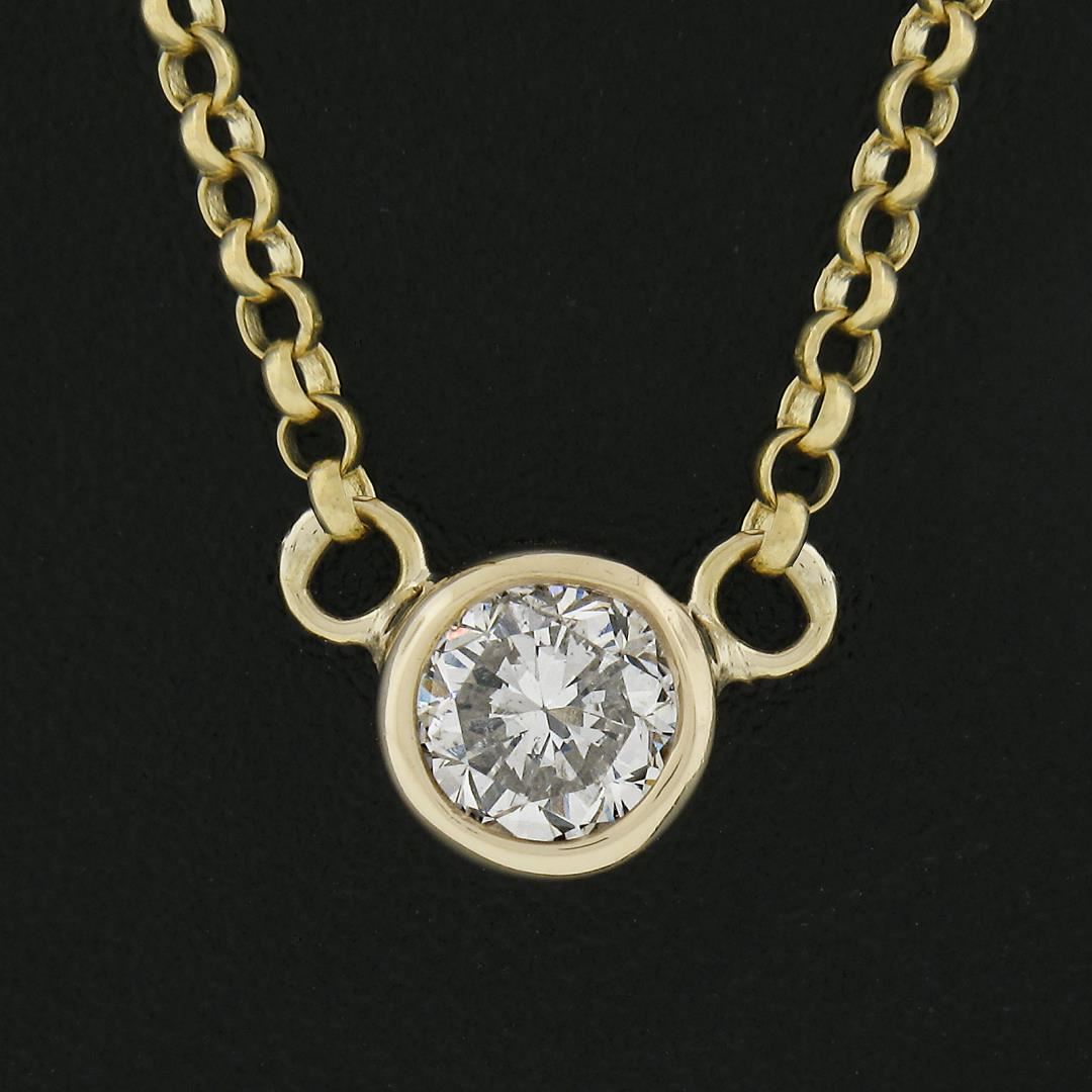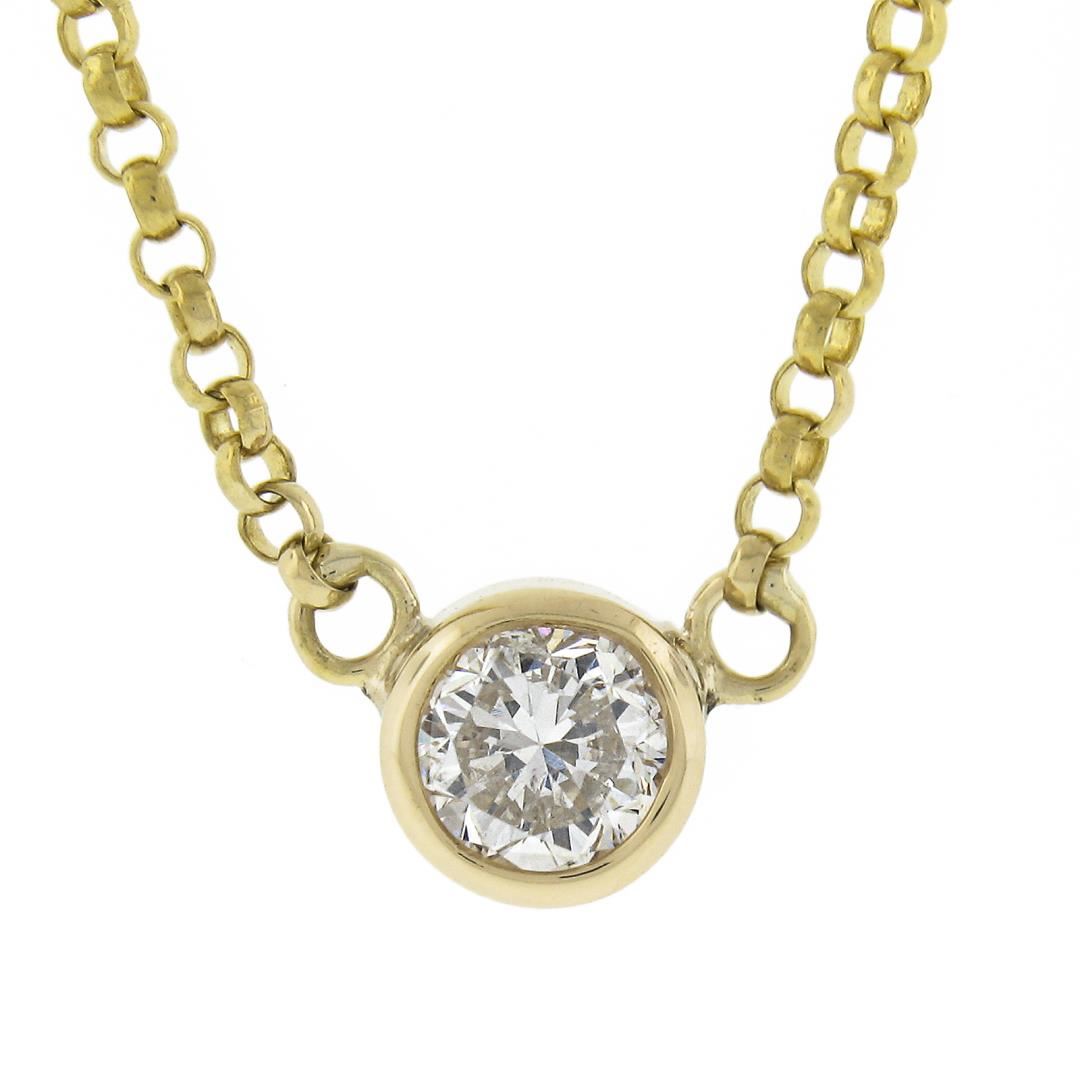 A solid 14k yellow gold pendant necklace, with 1 round cut natural diamond (G- I1 ; 0.33ct). 16 inch rolo link chain, 3.0 grams total weight, pendant measures 5.7mm.
