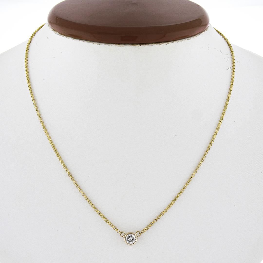 A solid 14k yellow gold pendant necklace, with 1 round cut natural diamond (G- I1 ; 0.33ct). 16 inch rolo link chain, 3.0 grams total weight, pendant measures 5.7mm.