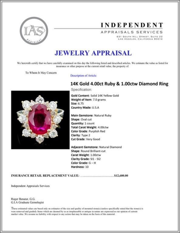 Regarding Appraised Jewelry and Loose Stones - Auctionfarm sends them out to a third party for Retail Replacement Value Appraisals, which are the most common. These types of evaluations are written for insurance needs. This would be the cost to replace the jewelry with an item of equal quality and kind, considered to be the current market price or the replacement value. This type of appraisal is done to protect you in the event of damage or loss of a valuable item. Our appraisals are conducted by independent 3rd Party appraisal firms that utilizes Certified GIA Gemologist. Appraisals should be used for verification of gemstone and/or metal weight, size, and grade only, not actual value. Appraisal value should be considered for insurance purposes only, not actual value, as price varies greatly from retail locations thru out the world. Items should not be purchased with the expectation to resell for appraisal price, or for profit.